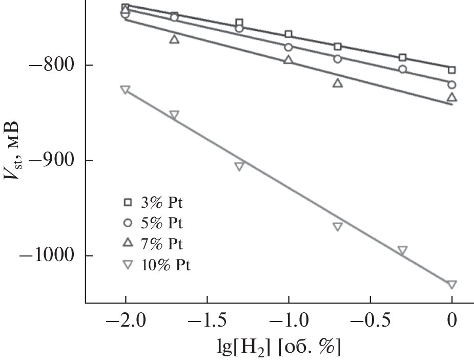 The effect of the platinum content (3–10 wt %) in the Pt/SnO2(Sb)-based working-electrode material on the properties (sensitivity, high-speed performance, recovery time) of solid-state potentiometric gas sensors for hydrogen and carbon monoxide including their simultaneous presence in air is studied. Sensors with 5% Pt demonstrate the best characteristics: the efficient carbon-monoxide detection for its concentration from 0.01 to 1 vol %; no effect of hydrogen present in the CO + air mixture in concentrations comparable with the CO concentration; the shortest relaxation time (~30 s at 1% CO).