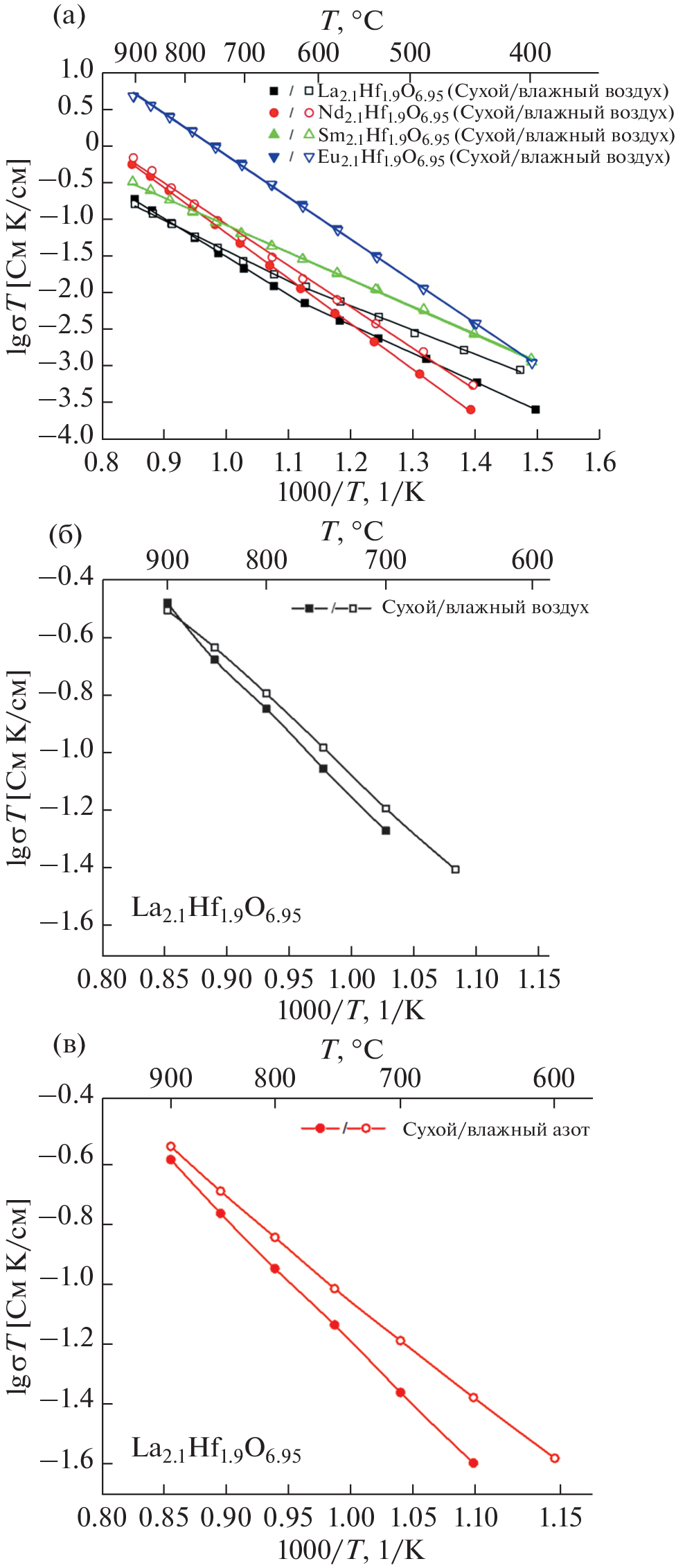 In this work, a high-density ceramics Ln2Hf2O7 (Ln = La, Nd, Sm, Eu, Gd) were synthesized by mechanical activation followed by high-temperature synthesis at 1600°C (3–10 h) and their transport properties were compared with those of Ln2.1Hf1.9O6.95 (Ln = La, Nd, Sm, Eu) doped solid solutions. The total conductivity of ceramics was studied using impedance spectroscopy and dc four-probe method; for Ln2Hf2O7 (Ln = Sm, Eu), by determining the total conductivity as a function of oxygen partial pressure. The maximum oxygen-ion conductivity was observed for Gd2Hf2O7 (~1 × 10–3 S/cm at 700°C); it was shown to approach the conductivity of Gd2Zr2O7 (~2 × 10–3 S/cm at 700°C) for the first time. Thus, the gadolinium hafnate can be a promising material for further doping in order to obtain highly conductive electrolytes. Among pure rare-earth hafnates, the proton conductivity was reliably observed for Nd2Hf2O7 only; however, ac measurements detected low-temperature proton conductivity in the Gd2Hf2O7 up to 450°С as well. With a decrease in the lanthanide ionic radius, the oxygen-ion conductivity increased in the Ln2Hf2O7 (Ln = La, Nd, Sm, Gd) series. Although the conductivity of samarium hafnate is an order of magnitude lower than that of Gd2Hf2O7, it has a wide range of oxygen-ion conductivity (~10–18–1 atm at 700, 800°C); there is no contribution from hole conductivity in air, in contrast to Eu2Hf2O7. Among doped Ln2.1Hf1.9O6.95 pyrochlore solid solutions (Ln = La, Nd, Sm, Eu), the proton conductivity of ~8 × 10−5 S/cm at 700°C was shown in Ln2.1Hf1.9O6.95 (Ln = La, Nd). With a decrease in the lanthanide ionic radius, the proton conductivity disappeared; the oxygen-ion one, increased.