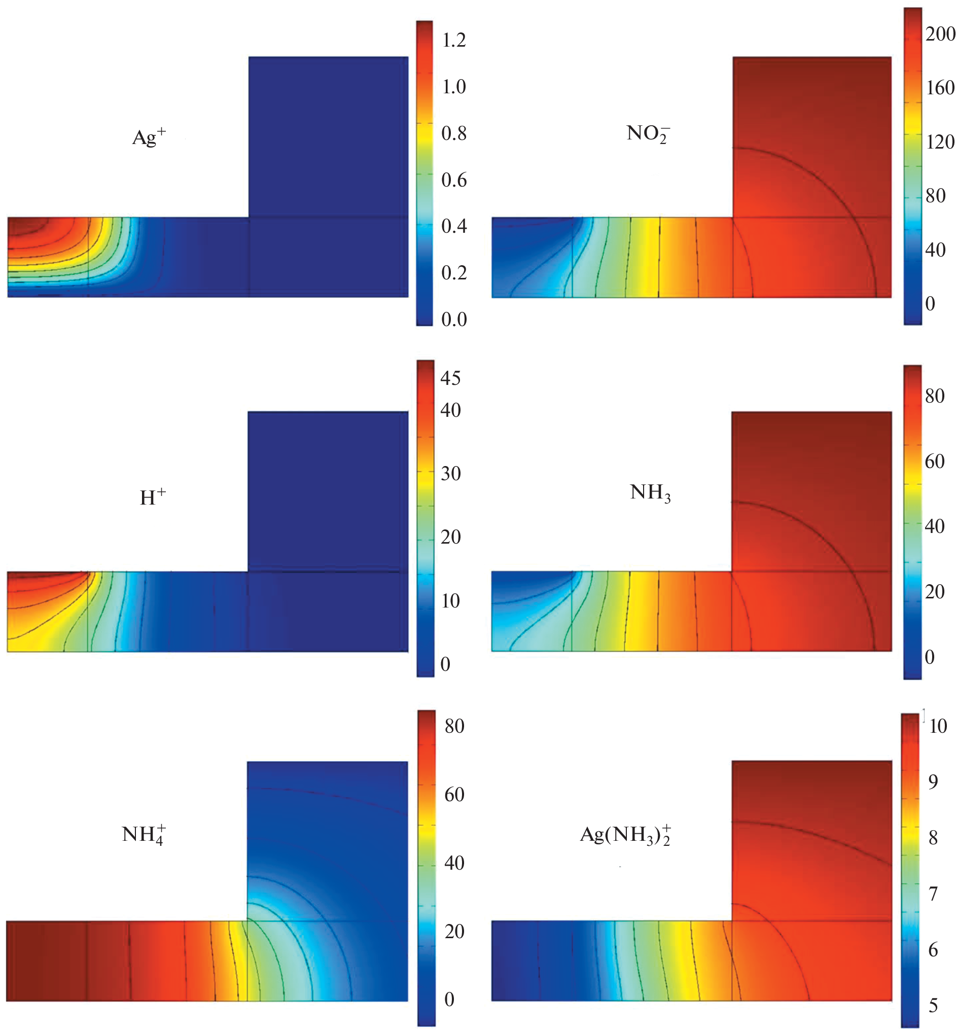 The distributions of the concentrations of the participants in the reactions and the current density of silver ion reduction are calculated for various concentrations of solution components and interelectrode distances. The degree of localization of metal deposition depends on the distribution of the concentrations of electroactive silver cations and the nonelectroactive complex of this metal near the anode. The conditions for reaching the maximum rate of local silver electrodeposition are determined.