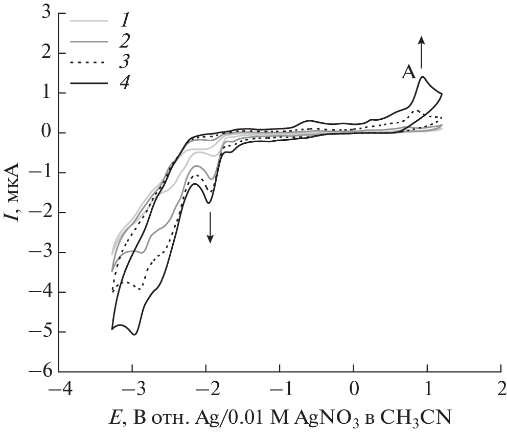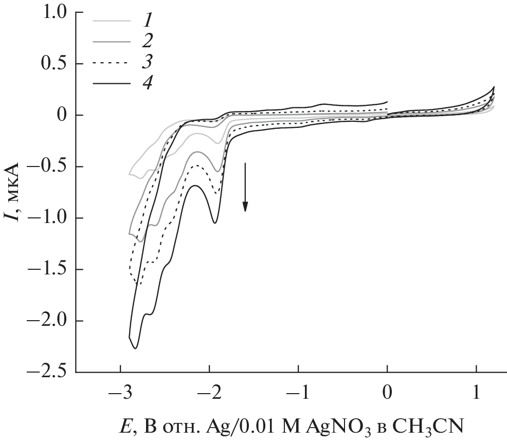 The electrochemical behavior of tetra-4-[4-(2,4,5-trichlorophenoxy)]phthalocyaninates of cobalt(II) (CoPc) and copper(II) (CuPc) in N,N-dimethylformamide 0.1 M nBu4NBF4 was studied by cyclic voltammetry. It has been experimentally established that both metal complexes are capable of irreversible reduction. In the reverse part of the CV curve for CoPc, an oxidation peak is observed, which is absent during anodic scanning, and corresponds to the cathodic reaction product. The metal complexes themselves do not oxidize under the conditions.