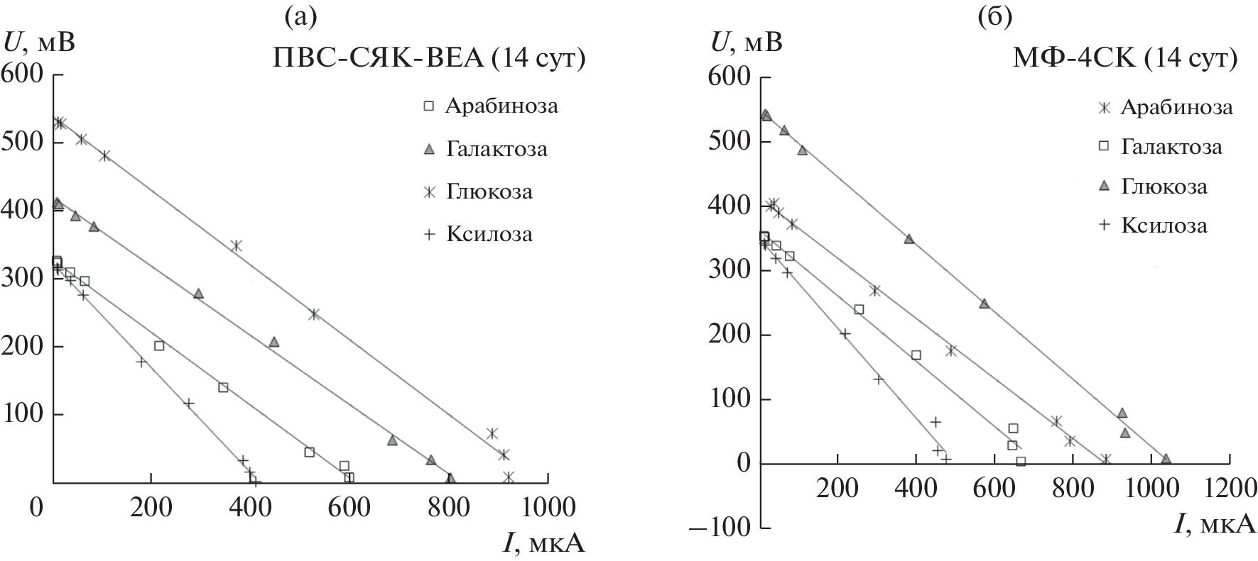 We studied the physicochemical and electrochemical characteristics of microbial fuel cells (MFCs) with a new proton-exchange membrane. It was synthesized on the basis of zeolite-doped polyvinyl alcohol cross-linked with sulfosuccinic acid (PVA-SSA-BEA). An MF-4SK industrial membrane (Plastpolymer, Russia) was used as a comparative sample. Various sugars were added as substrates (glucose, arabinose, galactose, xylose). The role of the bioagent was performed by the strain Micrococcus luteus 1-i. MFCs with PVA-SSA-BEA and MF-4SK membranes showed rather close electrochemical characteristics. A higher electricity output was performed with the addition of glucose, galactose, the lowest - with the use of xylose. The data obtained indicate that the proposed PVA-SSA-BEA membrane is promising for use as an alternative to proton-exchange membranes widely used in fuel cell technology.