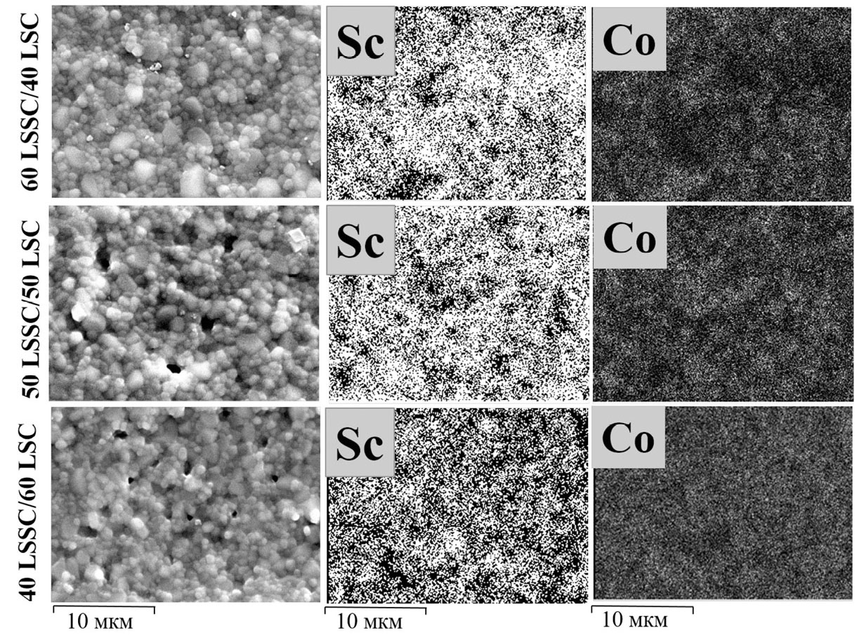 Микроструктура поверхности полученных композитов представлена на рис. 4. С увеличением содержания фазы LSC в композите незначительно уменьшается средний размер зерен керамики с 0.456 мкм для 60LSSC10–40LSC, на 0.448 мкм для 50LSSC10–50LSC и 0.440 мкм для 40LSSC10–60LSC. Элементный анализ показал равномерное распределение ионов лантана и стронция по поверхности образца и закономерные изменения содержания ионов скандия и кобальта.