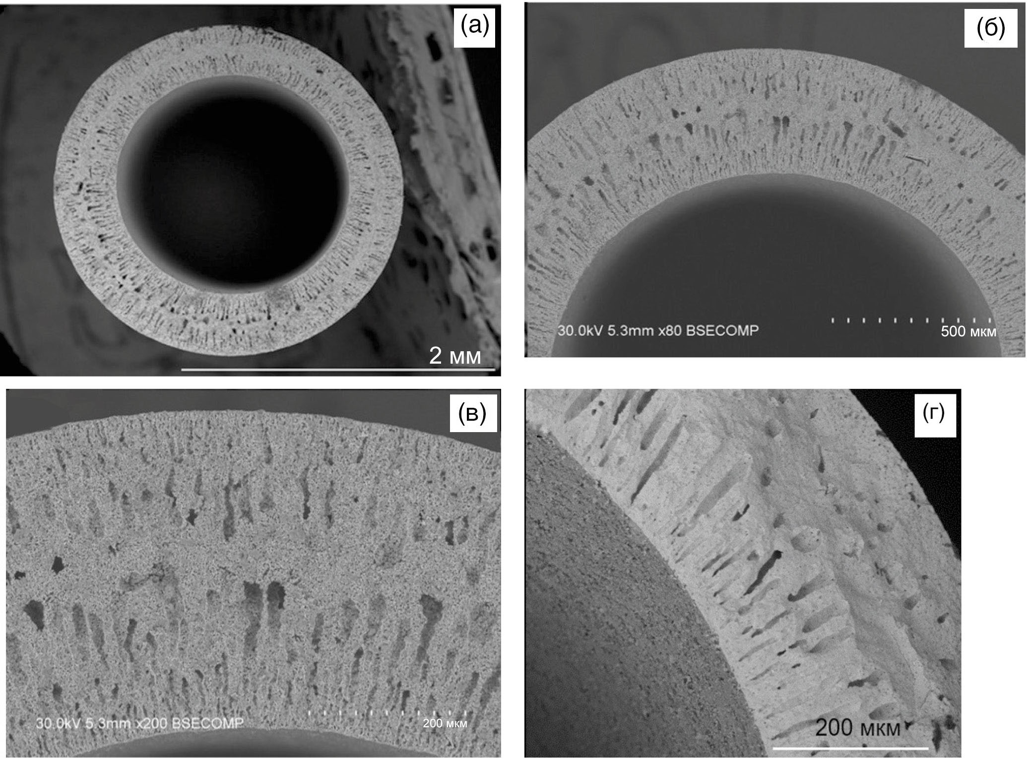 Рис. 1. а, б, в – СЭМ-изображения поперечного сечения МТ-мембраны BSCFM5, изготовленной с помощью метода фазовой инверсии; г – СЭМ-изображение МТ-мембраны BSCFM5 после испытаний.