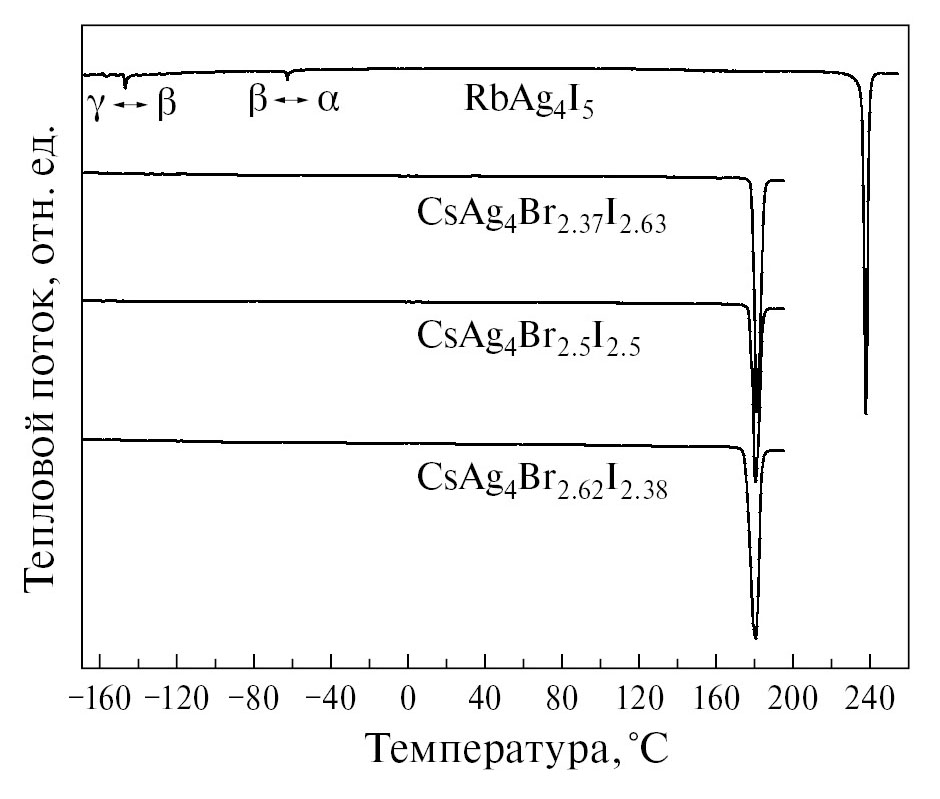 3. Fig. 2. DSC curves for synthesized samples of solid electrolytes CsAg4Br3-хI2+х (x = 0.38; 0.50; 0.63) and RbAg4I5.