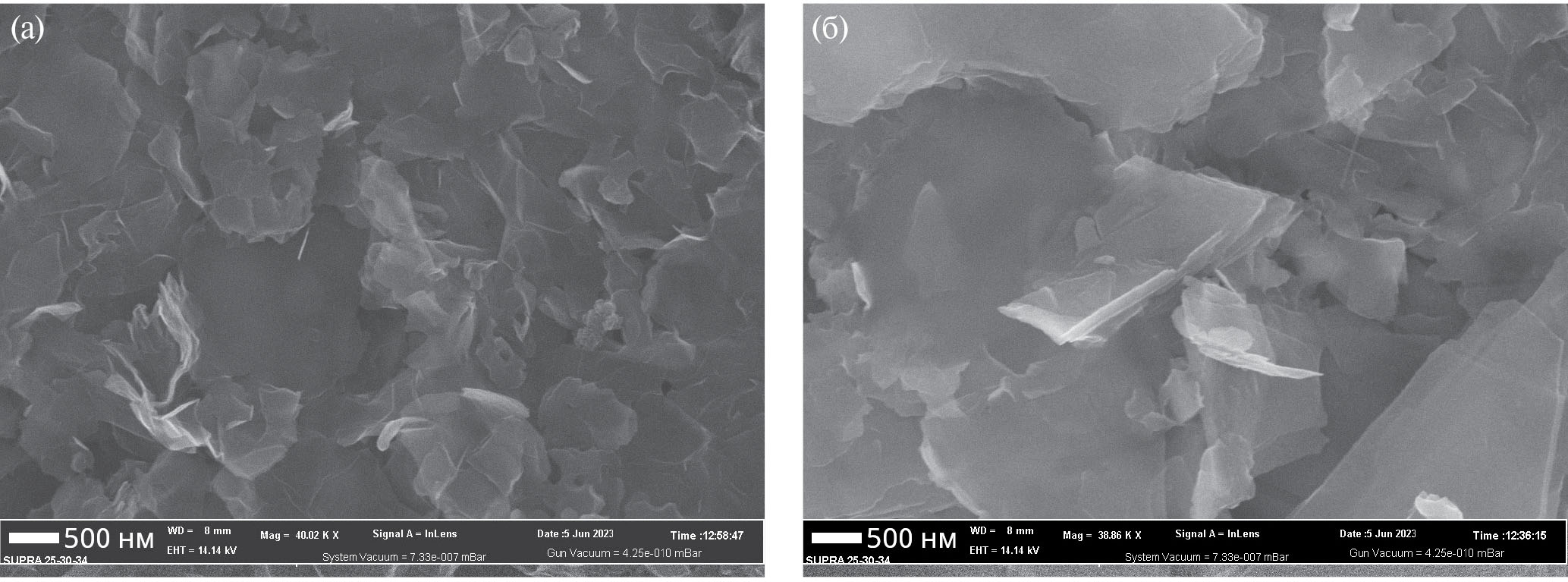 На рис. 1 приведены СЭМ-изображения N-МГС и Co-ФС. Из рис. 1а видно, что N-МГС представляют собой графеноподобные структуры с характерными латеральными размерами в пределах от 0.02 до 0.20 мкм. Как было показано в [14], толщина N-МГС составляет 2–3 нм (7–10 графеновых слоев). В случае Co-ФС на изображении можно выделить фосфореновые структуры (рис. 1б), поверхность которых частично декорирована агломератами атомов кобальта.