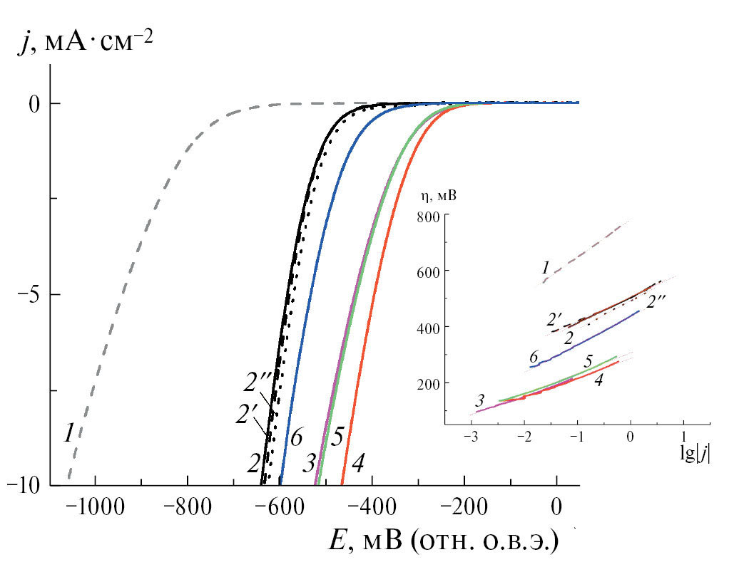Кинетика реакции выделения водорода для N-МГС, Co-ФС и смесевых катализаторов Co-ФС/N-МГС была исследована методом вращающегося дискового электрода. Для всех катализаторов на вольтамперограммах, приведенных на рис. 3, наблюдался рост тока выделения водорода по мере катодной развертки потенциала. Из рисунка видно, что каталитическая активность N-МГС (кривые 2–2’’) заметно превышает таковую для СУ (кривая 1) и заключается в существенном уменьшении перенапряжения РВВ (η), которое практически не зависит от загрузки материала на электроде (η ≈ 0.63 В при плотности тока 10 мА/см2, ср. η ≈ 1.06 В для стеклоуглерода). В то же время активность Co-ФС (кривая 3) оказывается заметно выше, чем у N-МГС и характеризуется величиной η ≈ 0.53 В. Неожиданным фактом, обнаруженным в данной работе, является заметное уменьшение перенапряжения выделения водорода по сравнению с исходными Co-ФС при небольших концентрациях N-МГС в смесевом композите, что однозначно свидетельствует о наличии синергетического эффекта при смешении в определенной пропорции дисперсий Co-ФС с N-МГС. Минимальные значения η ≈ 0.46 В наблюдаются для смеси Co-ФС/N-МГС(8 : 1) (кривая 4), при этом для более концентрированных по N-МГС смесевых составов регистрируется заметное увеличение η, приближающееся к значению, характерному для исходных N-МГС (кривые 5, 6). Последнее указывает на недостаточное число активных центров РВВ, связанных с Co-фосфореновыми структурами, по сравнению с их количеством на допированных азотом графеновых структурах, что приводит к практически полному переключению реакции выделения водорода на эти центры. На врезке к рис. 3 приведены тафелевские зависимости для всех рассмотренных образцов. Наклон представленных прямых составляет 90–100 мВ/дек для N-МГС и 70 мВ/дек для Co-ФС. По мере увеличения содержания малослойных графеновых структур в смесевом катализаторе тафелевский наклон увеличивается от 70 мВ/дек для смеси 8 : 1 до 75 и 100 мВ/дек для смесей 7 : 2 и 5 : 4, соответственно. Таким образом, с уменьшением содержания фосфореновых структур в смесевом катализаторе, его активность падает и приближается к таковой для N-МГС. Важно отметить, что все исследованные катализаторы демонстрируют достаточную стабильность характеристик в течение 1000 циклов развертки потенциала в интервале от 0 до –600 мВ. Что касается природы синергетического эффекта, то ее установление является предметом дальнейших исследований.