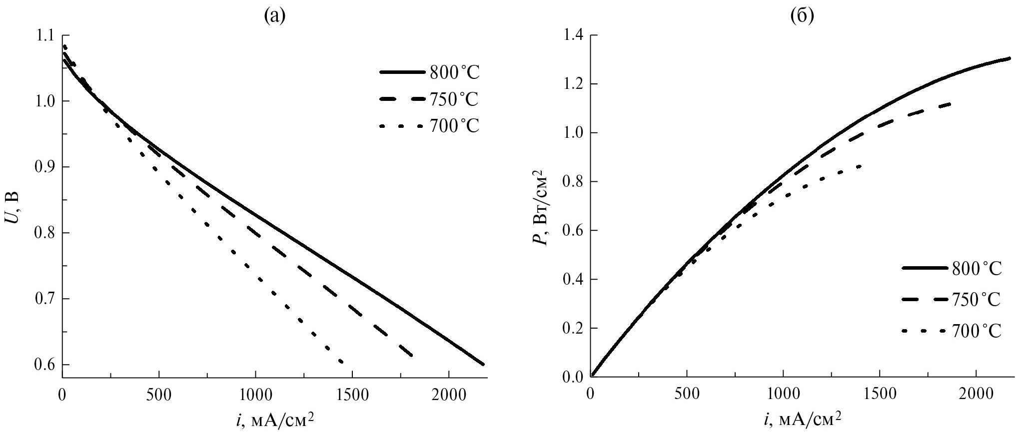 Рис. 4. Вольт-амперные (а) и мощностные (б) характеристики ТОТЭ, полученные при 700, 750 и 800°С.