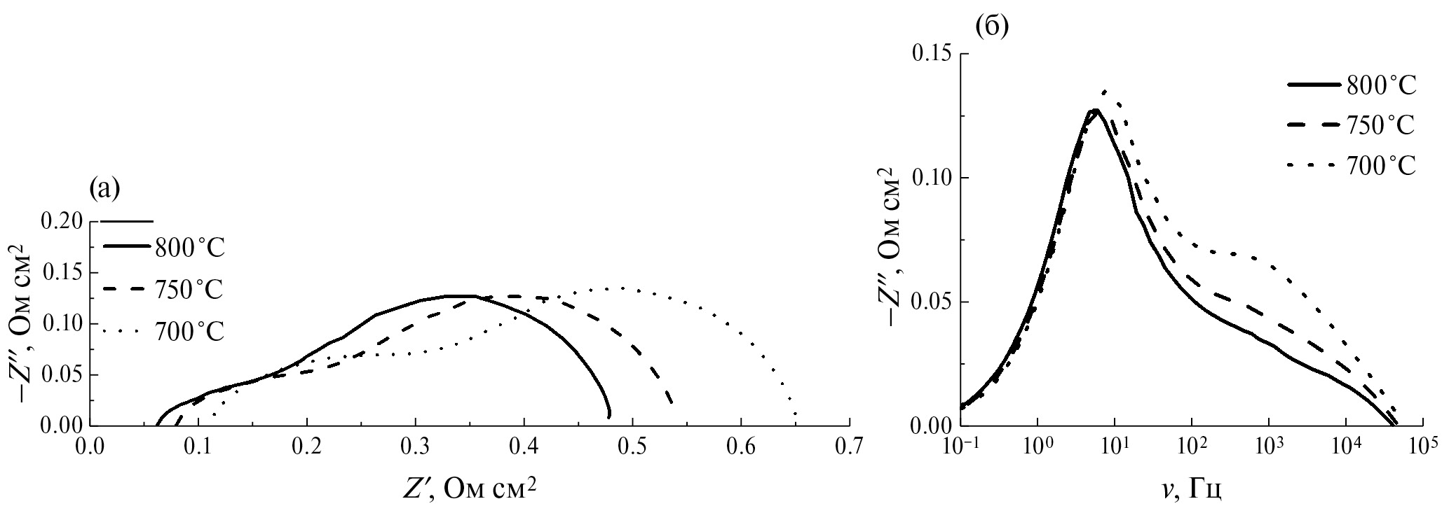 Рис. 5. Годографы импедансных спектров ТОТЭ (а) и их частотная зависимость (б), полученные при 700, 750 и 800°С.