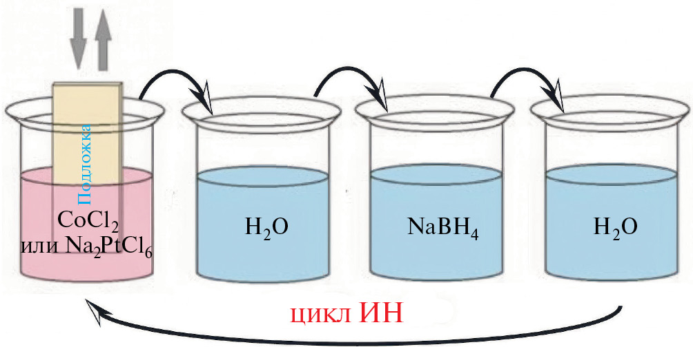 Подобные композиты синтезировали в водных растворах путем реакции гальванического замещения между H2PtCl6 и наночастицами Co(0) [9], методом горения в растворах [10], методом электрохимического осажления в импульсном режиме [11] и т.д. Новые возможности для синтеза подобных электрокатализаторов открывает метод ИН или по англо-язычной терминологии Successive Ionic Layers Deposition (SILD) [12, 13] или Successive Ionic Layer Adsorption and Reaction (SILAR) [14], который основан на использовании при синтезе последовательных реакций адсорбции из растворов солей катионов и анионов, взаимодействующих на поверхности подложки и образующих слой контролируемого состава. Данный метод позволяет наносить покрытия на поверхность подложек сложной формы и с максимально возможной точностью контроля их толщины. Последнее обстоятельство открывает возможность синтеза мультислоев нанокомпозитов с уникальными структурно-химическими характеристиками, которые другими методами получены быть не могут.