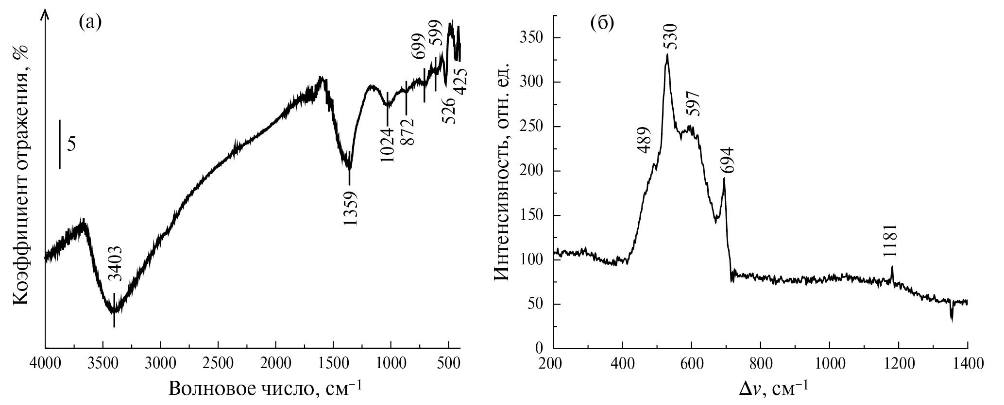 Чтобы охарактеризовать кобальтсодержащие нанослои, синтезированные в условиях ИН, их исследовали с помощью ИК-Фурье-спектроскопии и спектроскопии КР (рис. 3). Как следует из ИК-Фурье-спектра ДО, показанного на рис. 3а, в спектре наблюдаются полосы поглощения с максимумами при 526, 599, 699, 872, 1024 и 1359 см−1. Согласно [22], эти полосы поглощения могут быть отнесены к гидроксиду кобальта Co(OH)2. Спектр КР, показанный на рис. 3б, также подтверждает этот вывод, поскольку он характеризуется 4 пиками с максимумами при 489, 530, 597 и 694 см−1, относящимися, в соответствии с результатами [23], к Co(OH)2 с аморфной структурой.