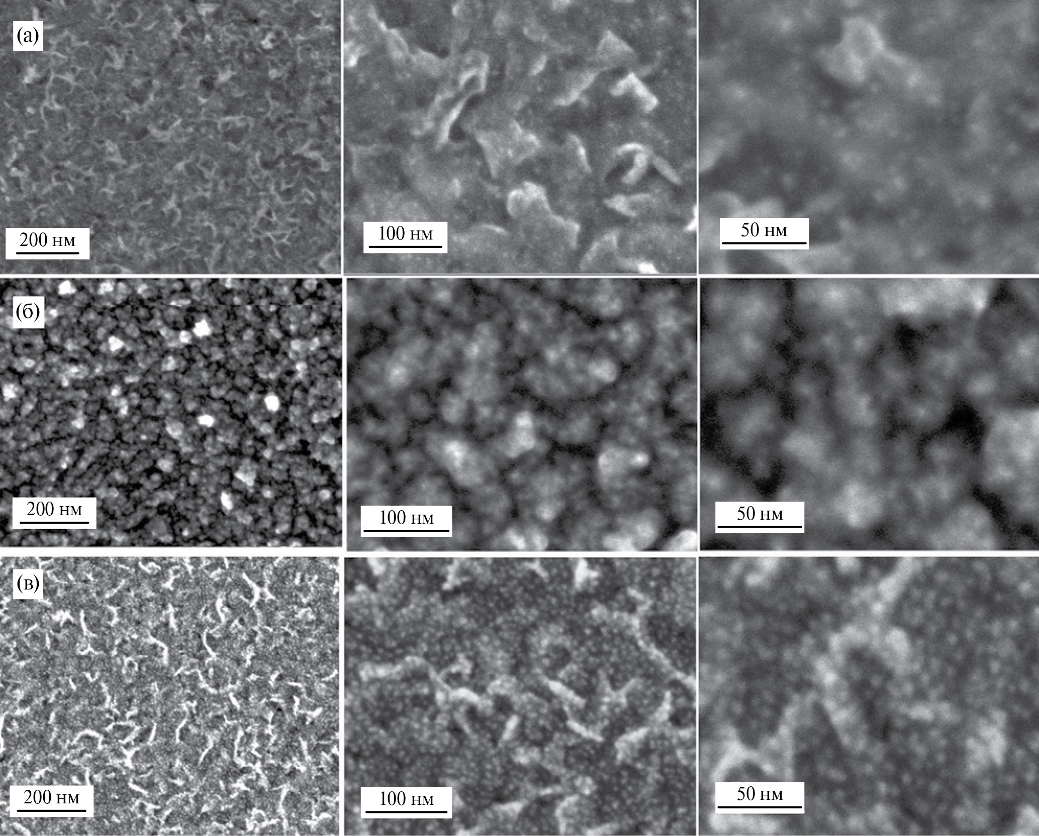 Рис. 4. Серии электронных микрофотографий, полученных методом СЭМ с увеличением ×100, ×250 и ×500 раз мультислоев на поверхности никеля, синтезированных методом ИН в результате 5 циклов обработки растворами СoCl2 и NaBH4 и последующих 5–40 циклов обработки с использованием растворов Na2PtCl6 и NaBH4. а) образец 5Co(OH)2-5Pt, б) 5Co(OH)2-20Pt, в) 5Co(OH)2-40Pt.