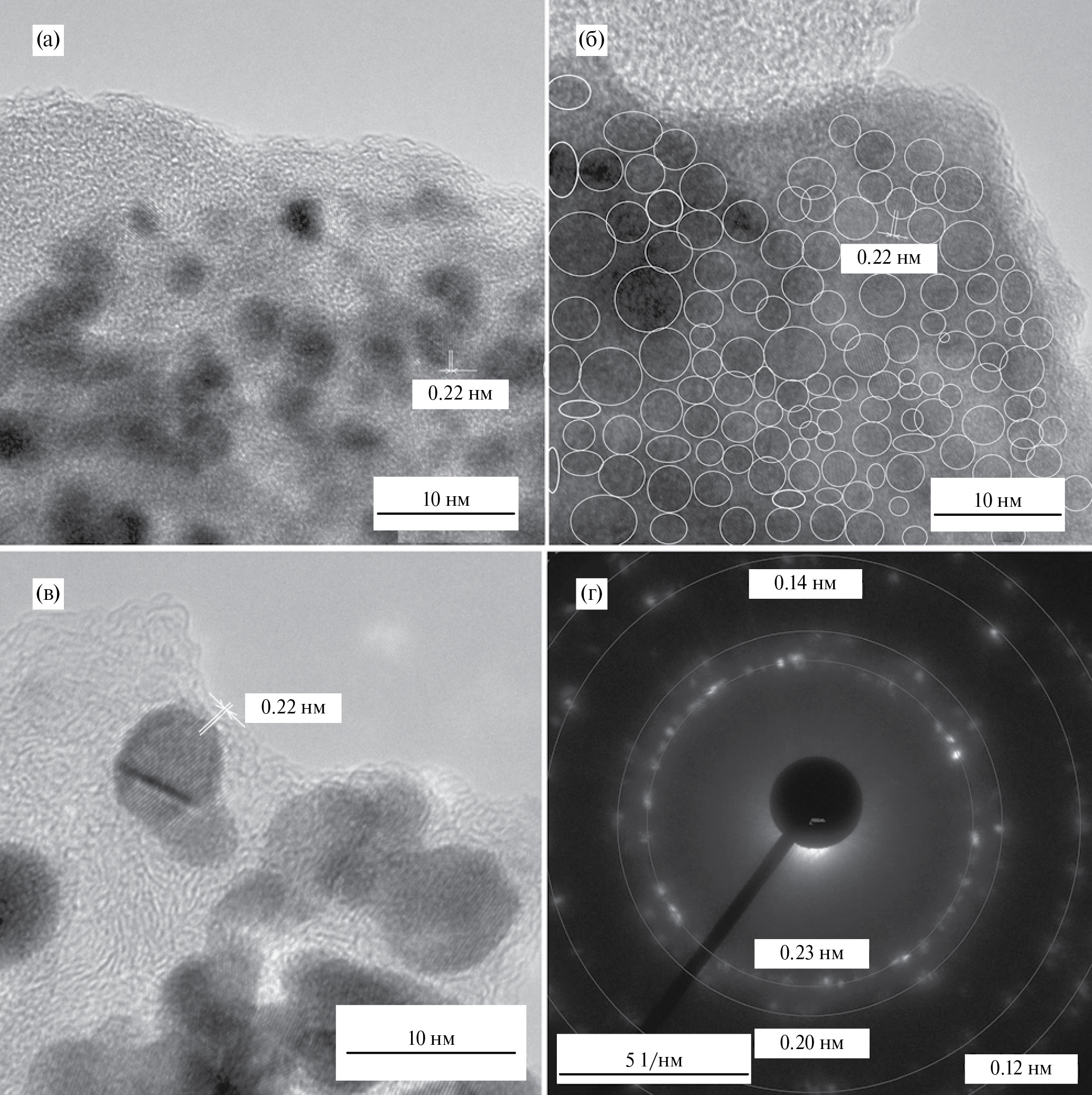 Рис. 5. ПЭM-электронные микрофотографии наночастиц, синтезированных методом ИН на поверхности никеля в результате 5 циклов обработки растворами СoCl2 и NaBH4 и 5–40 циклов обработки растворами Na2PtCl6 и NaBH4. а) образец 5Co(OH)2-5Pt, б) 5Co(OH)2-20Pt, в) 5Co(OH)2-40Pt, г) электронная дифрактограмма образца 5Co(OH)2-40Pt.