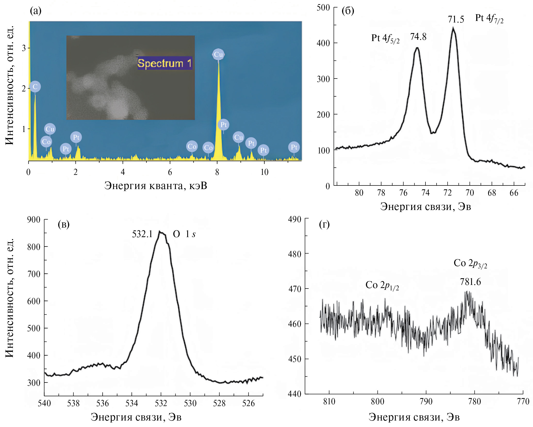Подобное отнесение следует также из результатов их исследования методом РСМА (рис. 6а) и РФЭС (рис. 6б). В спектрах РФЭС можно заметить пик с максимумом при 781.6 эВ, характерный для 2p3/2-электронов атомов Co, и пик с максимумом при 71.5 эВ, относящийся к 4f7/2-электронам атомов платины [25]. Важную информацию также можно получить при анализе РФЭ-спектра 1s-электронов атомов кислорода (рис. 6в). Согласно [26], его положение при 532.1 эВ свидетельствует об образовании данными атомами химических связей с атомами Co и водорода.