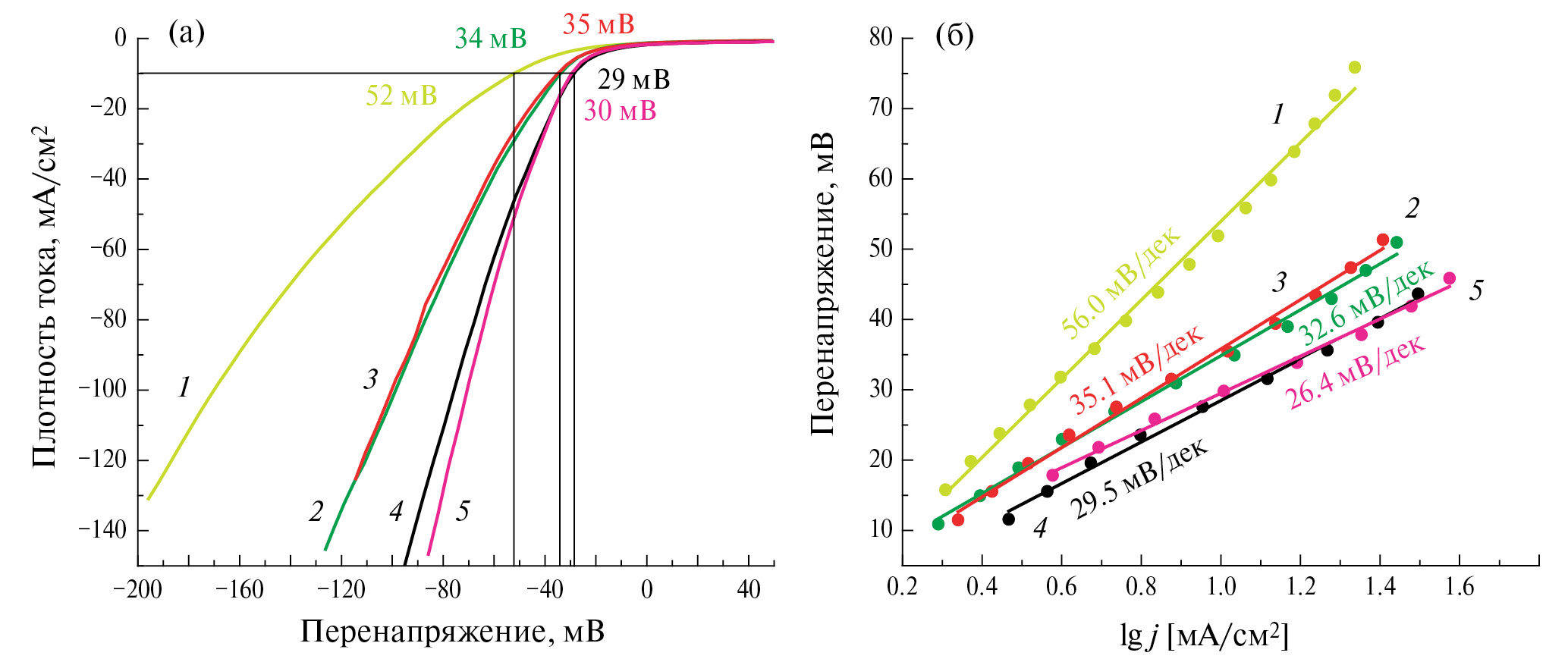 Рис. 7. Поляризационные кривые (а) и значения наклона Тафеля (б) в РВВ для электродов ПН с мультислоями nCo(OH)2-mPt, синтезированными методом ИН. 1 – образец 5Co(OH)2-5Pt, 2 – 5Co(OH)2-10Pt, 3 – 5Co(OH)2-20Pt, 4 – 5Co(OH)2-40Pt, 5 – 5Co(OH)2-60Pt.