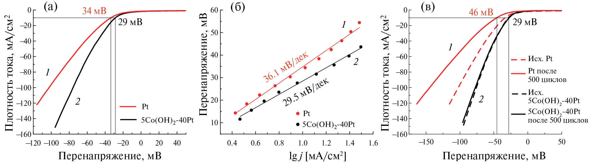 Изучение электрокаталитических свойств синтезированных образцов показало, что для образца 5Co(OH)2-5Pt значение перенапряжения в РВВ составляет 52 мВ, образца 5Co(OH)2-10Pt – 34, 5Co(OH)2-20Pt – 35, 5Co(OH)2-40Pt – 29 и образца 5Co(OH)2-60Pt – 30 мВ (рис. 7а). Данный ряд образцов характеризуется также значениями наклонов Тафеля, которые изменяются от 56 мВ/дек и до 26.4 мВ/дек (рис. 7б). Обращает на себя внимание, что значения перенапряжений и наклонов Тафеля закономерно уменьшаются в ряду подобных образцов, полученных в результате 5–40 циклов ИН. В то же время образец, который получен после 60 циклов ИН, характеризуется фактически таким же значением перенапряжения, как и полученный после 40 циклов, однако имеет несколько меньшее значение угла наклона Тафеля, а именно 26.4 по сравнению с 29.5 мВ/дек. В этой связи с учетом того, образец 5Co(OH)2-40Pt содержит меньшее количество платины, было решено считать его электрокаталитические свойства оптимальными и рекомендовать такой образец для изучения стабильности электрокаталитических свойств.