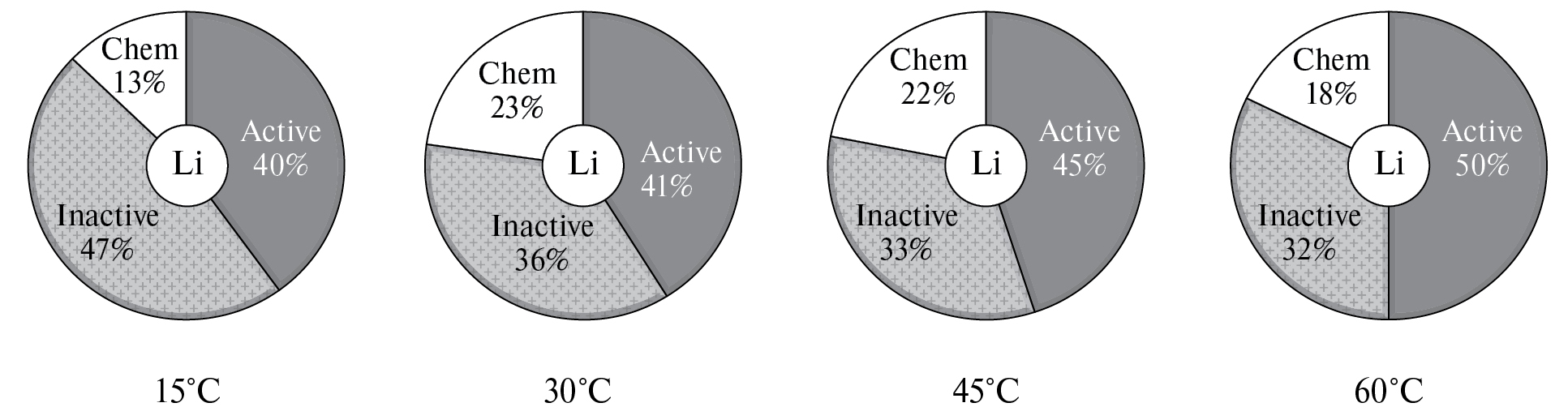 Температура различным образом влияет на состав катодных осадков. Так, с увеличением температуры циклирования количество электрохимически активного лития увеличивается, электрохимические неактивного – уменьшается, а химически связанного – первоначально увеличивается, а затем снижается (рис. 3г и 6).