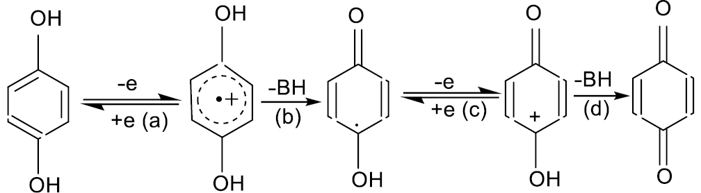Электроокисление также было исследовано достаточно подробно. При ЭО простейшего представителя — гидрохинона в водных средах с высоким выходом образуется нерастворимый хингидрон, а в апротонных — протонированный хинон (на схеме 2 эта стадия не приводится). Механизм ECE-процесса оказался достаточно сложным, а полученные результаты — противоречивыми, особенно, что касается числа участвующих электронов n, природы интермедиатов и промежуточных стадий. Но в целом он может быть описан схемой 2 [41–43]: