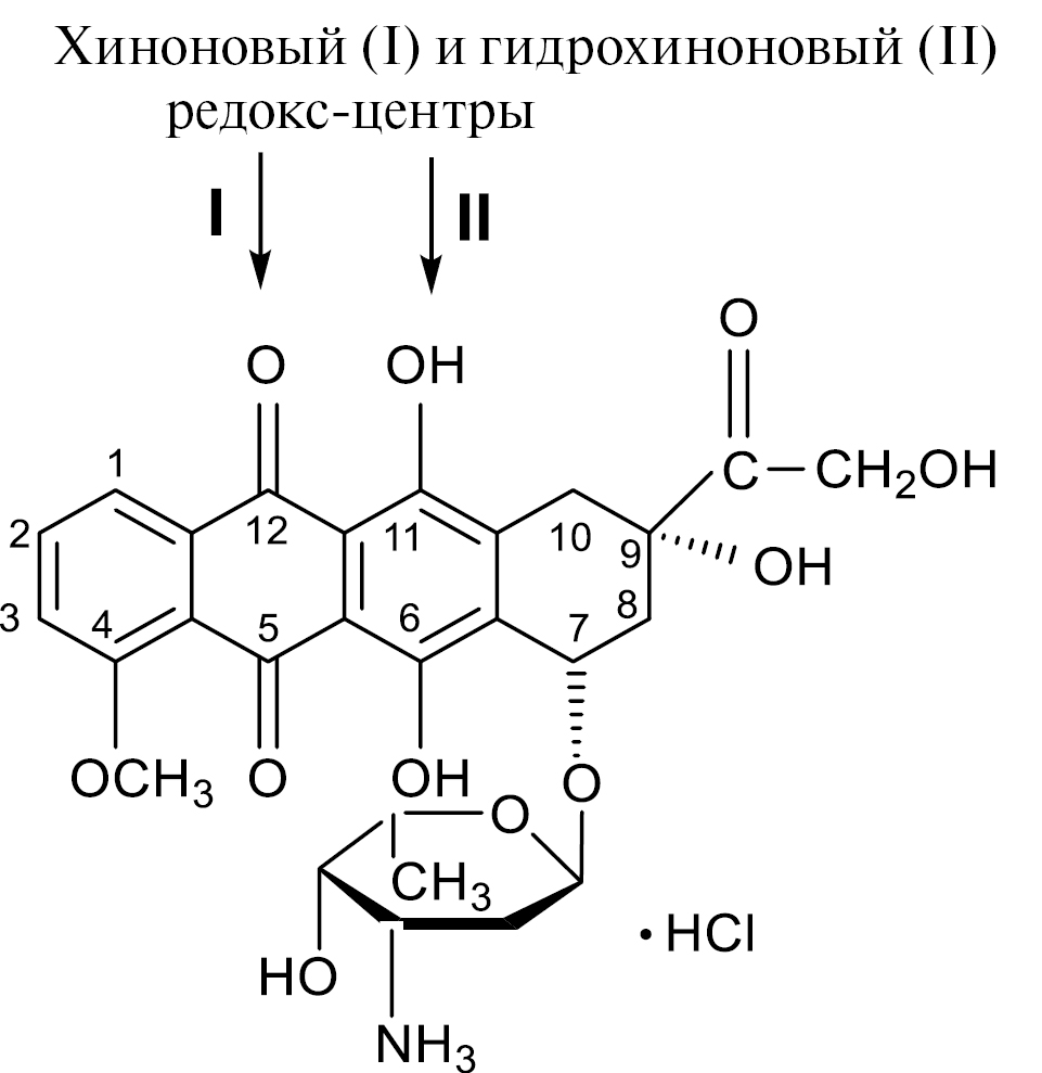 Антибиотик антрациклинового ряда доксорубицин (ДОКС, адриамицин, рКa 8.6) (8S,10S)-10-(4-амино-5-гидрокси-6-метил-тетрагидро-2H-пиран-2-илокси)-6,8,11-тригидрокси-8-(2-гидроксиацетил)-1-метокси-7,8,9,10-тетрагидротетрацен-5,12-дион принадлежит к производным хинона и отличается высокой активностью (химической и электрохимической). В значительной степени она обусловлена наличием в его составе двух реакционных центров — хинонового и гидрохинонового (рис. 1). ДОКС представляет собой полярную молекулу с высокой делокализацией заряда и является хорошим акцептором электронов.