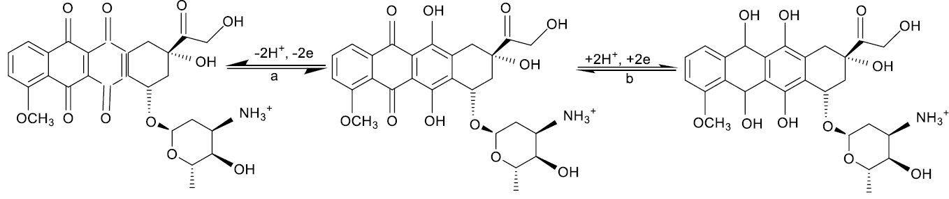 Многие авторы уделили значительное внимание исследованию электрохимических свойств ДОКС [9, 35, 48–65] и его электроаналитическому определению [35, 58, 60, 61, 65–74] — вначале на Hg [49–53, 58, 60, 66], а затем на ряде твердых электродов — Au, амальгаме Ag, Pt – и различных видах углерода — графите, пирографите (ПГ), базальной плоскости пиролитического графита (БППГ) [48, 54, 56, 57, 59–61, 65, 67–74], но в первую очередь на углеродном пастовом электроде (УПЭ). Фарадеевские сигналы на таких электродах выше, чем, например, на стеклоуглеродном, для которого систематических данных существенно меньше [9, 35, 61, 75]. По данным [48–61], в протогенных средах ДОКС восстанавливается аналогично классическим хиноновым производным — в одну обратимую двухэлектронную волну (схема 3; степень обратимости стадий не учитывается). Восстановлению подвергаются хиноновые группы молекулы в положениях 5, 12 антрациклинового хромофора [35, 49, 53, 56]. Согласно [53], равновесный потенциал E0 стадии a равен −0.61 В (pH 7.6), (−0.57 В по данным импульсного радиолиза [64]; pH 7.0) отн. нас.к.э.
