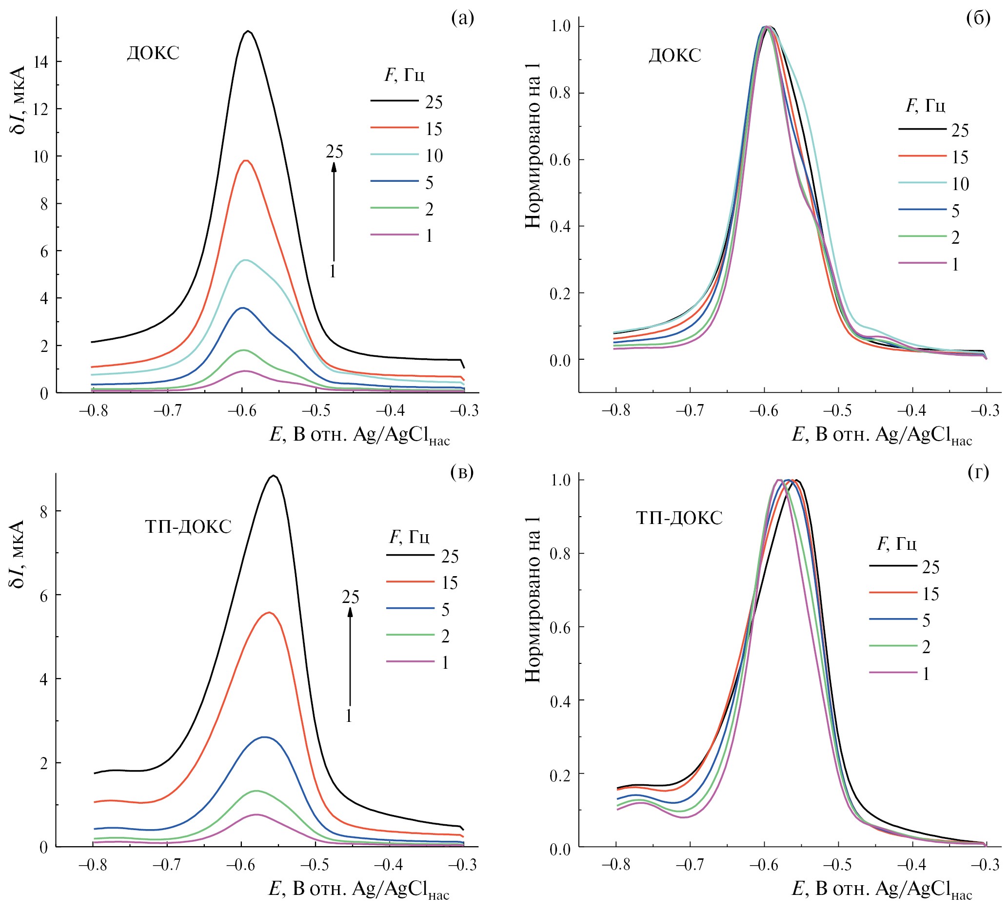 Еще более наглядными в этом смысле оказались данные КВВА. На рис. 7 приведены соответствующие кривые ДОКС и структуры ТП-ДОКС для того же диапазона потенциалов, что и на рис. 6, полученные при различных частотах (F = 1–25 Гц) (а, в) и затем для наглядности нормированные на одинаковую высоту (б, г). Хорошо видно, что с повышением частоты меняется форма и положение катодного пика около −0.6 В, при максимальной частоте (25 Гц) преобладает пик при −0.58 В, а при минимальной (1 Гц) — при −0.56 В. Для свободной формы ДОКС картина менее выражена, однако хорошо видны отклонения при низких частотах (1–10 Гц).