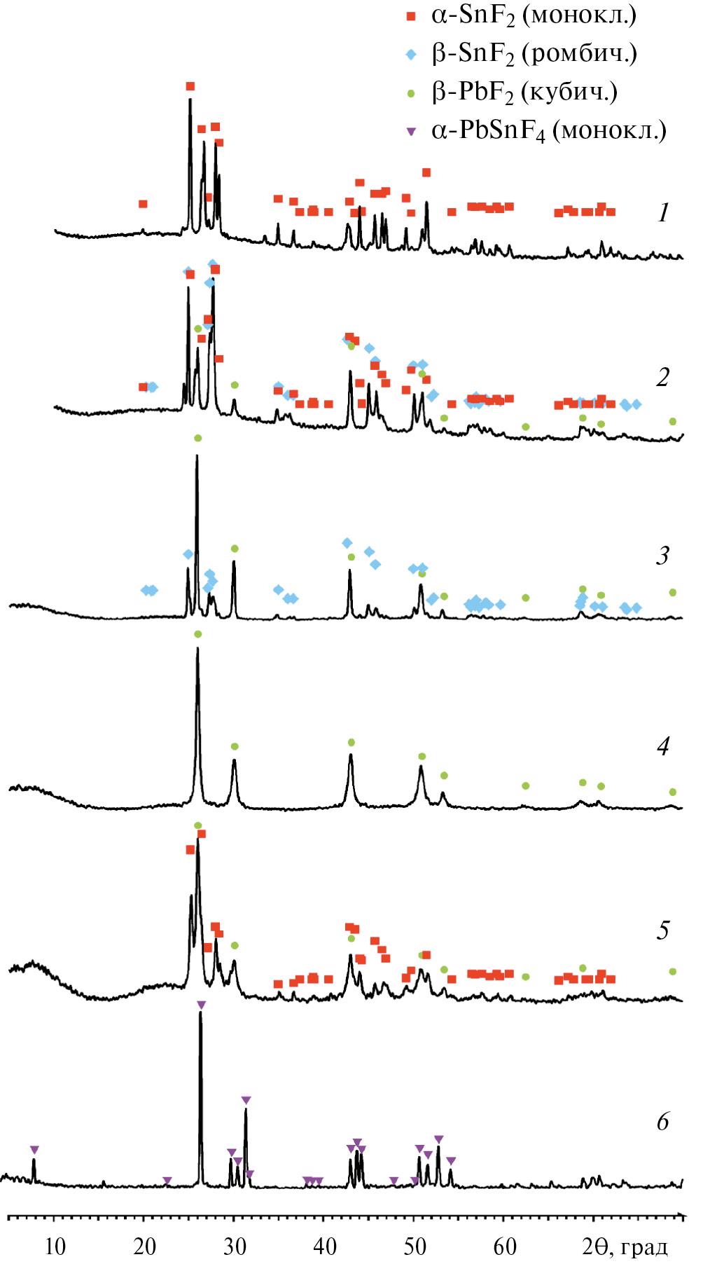 Рис. 1. Рентгенограммы исследованных образцов. 1–3: образцы E1 – E3, 4, 5 – образцы MC1 и MC2, 6 – α-PbSnF4