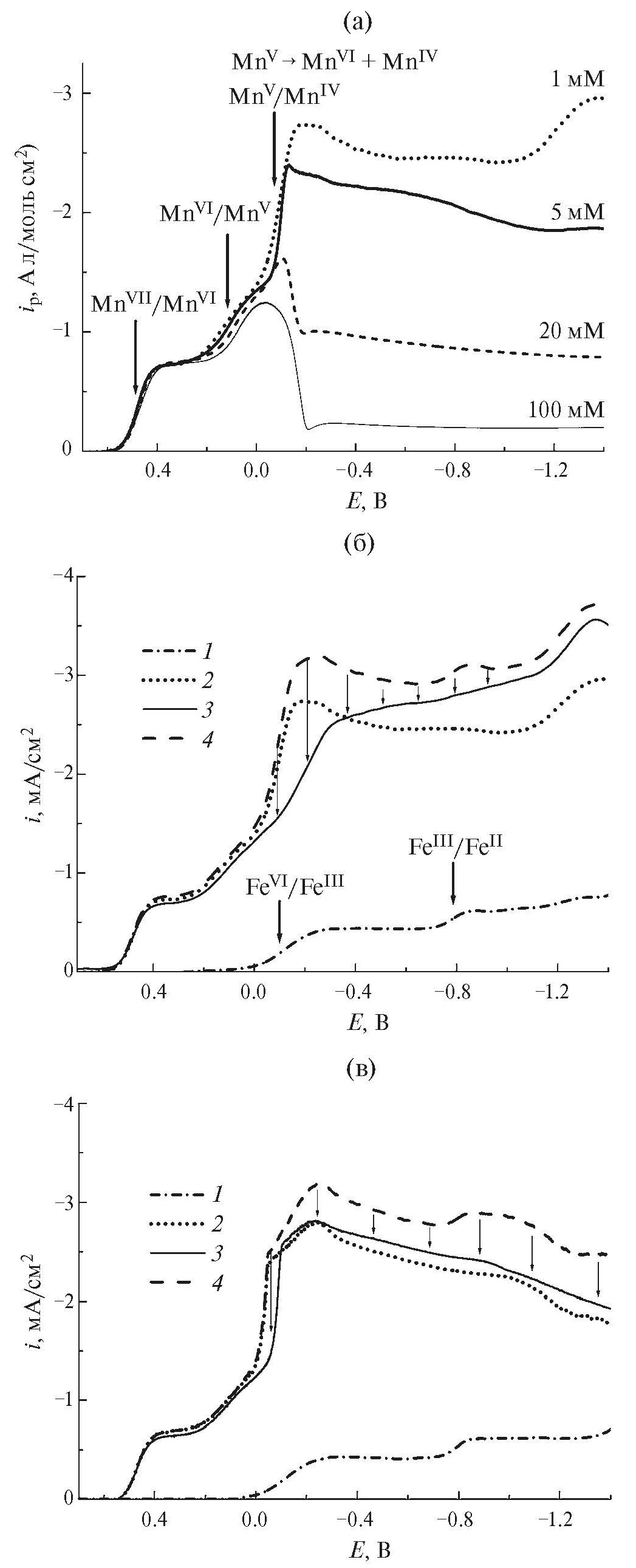 Рис. 1. Нормированные вольтамперограммы (а), зарегистрированные в растворах KMnO4 с различными концентрациями, указанными около соответствующих кривых. Вольтамперограммы при 100 (б) и 2 мВ/с (в), зарегистрированные в растворах 0.3 мМ K2FeO4 (1), 1 мМ KMnO4 (2), 1 мМ KMnO4 + 0.3 мМ K2FeO4 (3) и кривые (4), отвечающие сумме кривых 1 и 2. Скорость вращения – 900 об/мин