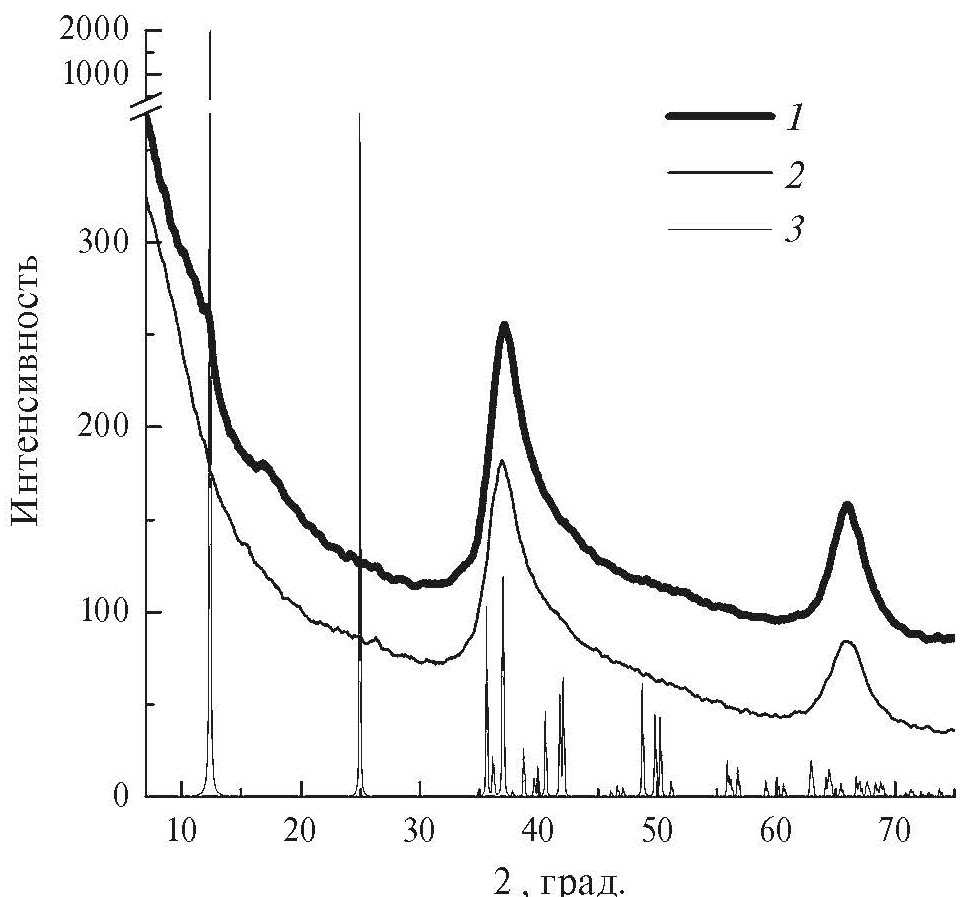 Потенциостатическое осаждение из раствора перманганата приводит к получению структурно разупорядоченной слоистой фазы бирнессита (рис. 3, кривая 1). На дифрактограмме вместо острых рефлексов, отвечающих хорошо закристаллизованному бирнесситу (рис. 3, вертикальные линии), наблюдаются уширенные и смещенные полосы [15]. Два асимметричных рефлекса при 37.2 и 66.0 град. отвечают внутрислойному упорядочению [27, 28]. Межслоевое упорядочение почти отсутствует, на что указывают слабые рефлексы при 11.2 и 17.0 град. Наблюдаемая картина соответствует турбостратно-искаженному бирнесситу [29]. Осадок, полученный из смешанного раствора (рис. 3, кривая 2), характеризуется полным отсутствием межслоевых рефлексов, что свидетельствует о росте разупорядочения. Отсутствие каких-либо новых рефлексов на дифрактограмме указывает на отсутствие других фаз. Это позволяет предположить, что железо в ходе осаждения встраивается в структуру бирнессита, а не соосаждается отдельной фазой.