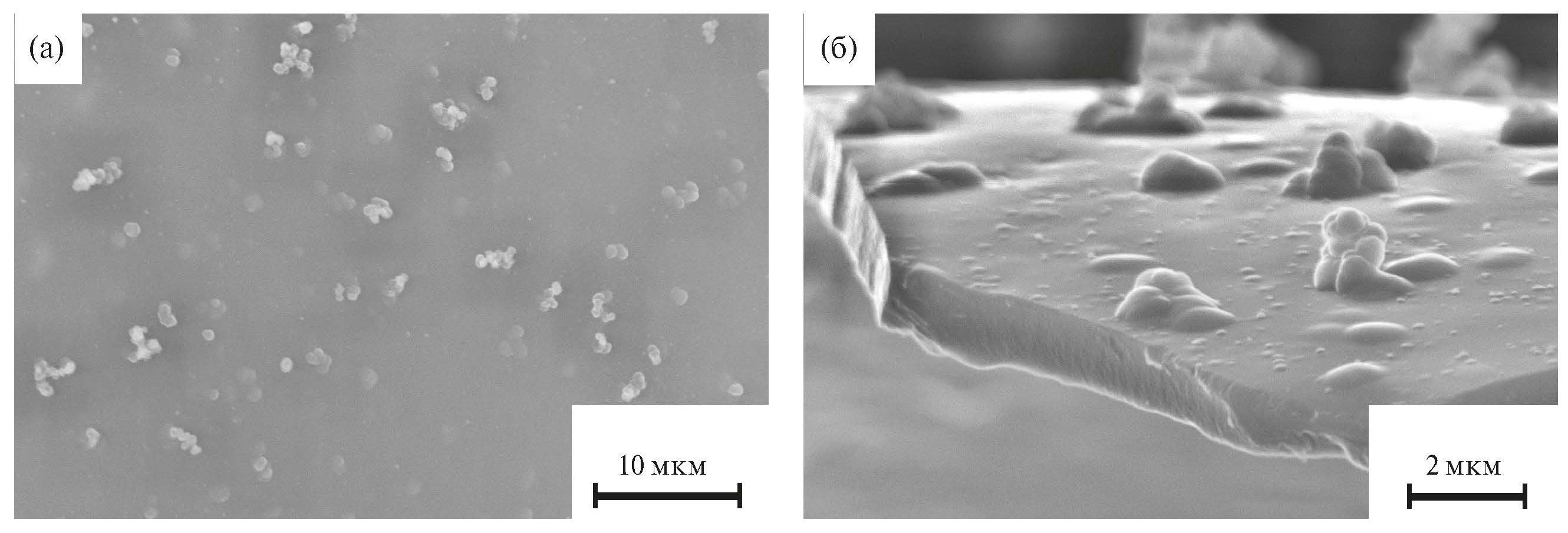 Добавки железа не оказывают заметного влияния на морфологию, толщину и адгезионные свойства бирнессита при его допировании. Пример поверхности и скола приведены на рис. 6. Поверхность осадка (рис. 6а) равномерная с отдельными глобулярными частицами коллоидного диоксида марганца, неизбежно возникающего в растворах осаждения. На сколе осадок однородный и равномерно плотный по толщине (рис. 6б), в отличие от допированных бирнесситов, получаемых химически [11, 13] и состоящих из пластинчатых кристаллов микронного и субмикронного размера. Различие в морфологии обусловлено структурно-фазовыми отличиями бирнесситов, получаемых различными способами.