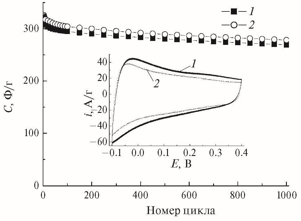 Рис. 8. Удельная емкость в ходе циклического перезаряжения бирнесситов, полученных из растворов 20 мМ KMnO4 (1) и 20 мМ KMnO4 + 0.3 мМ K2FeO4 (2). Скорость развертки потенциала – 100 мВ/с, заряд осаждения – 0.71 Кл/см2. На врезке приведены 2 (1) и 1000 (2) циклы бирнессита, осажденного из феррат-содержащего раствора