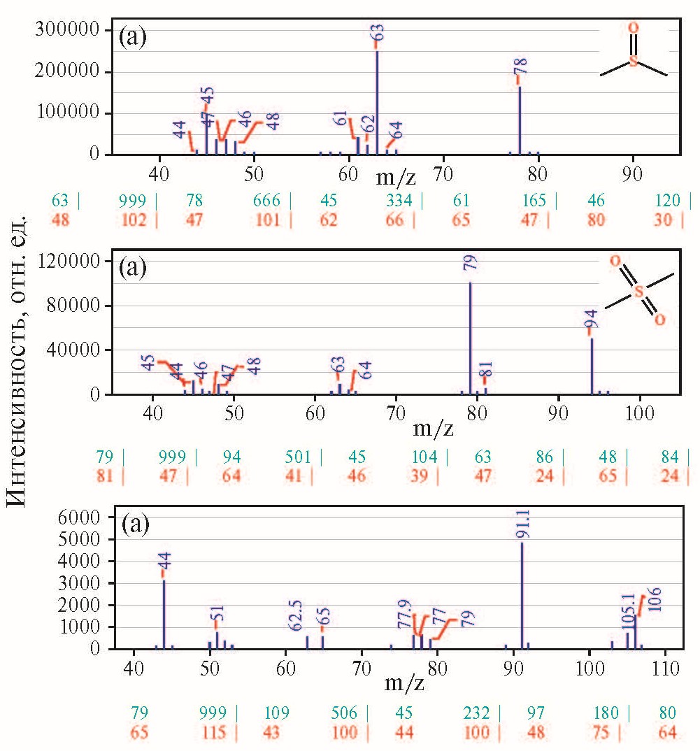 6. Fig. 5. Experimental mass spectra: a - dimethylsulfoxide, b - dimethylsulfone and c - ethyl ester of methanesulfonic acid (ethyl methanesulfonate) with characteristic peaks. Solvent - CHCl3