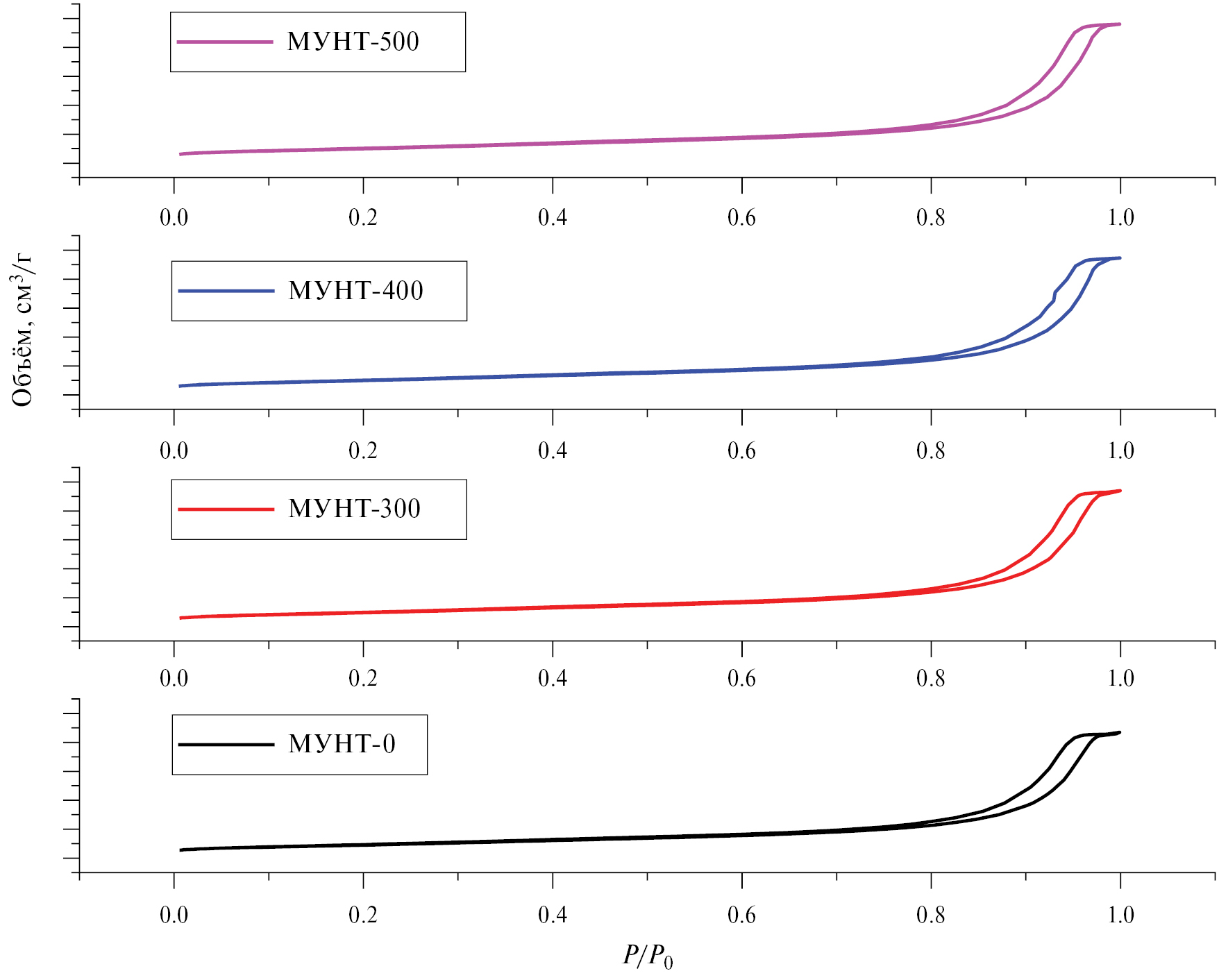 Текстурные характеристики. На изотермах адсорбции для всех образцов наблюдается гистерезис, характерный для цилиндрических пор, что согласуется с представлением о морфологии МУНТ (рис. 1). Величины удельной площади поверхности образцов имеют близкие значения (табл. 1), что указывает на то, что окислительная обработка и последующее восстановление водородом не приводят к изменению текстурных характеристик.