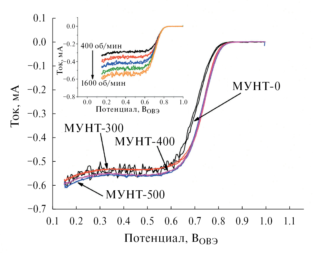 Рис. 7. ЦВА для исследуемых материалов, снятые на вращающемся дисковом электроде при скорости вращения 1600 об/мин в 0.1 М NaOH в присутствии кислорода. На вставке справа представлены ЦВА для МУНТ-0 при скоростях вращения 400–1600 об/мин в 0.1 М NaOH в присутствии кислорода.