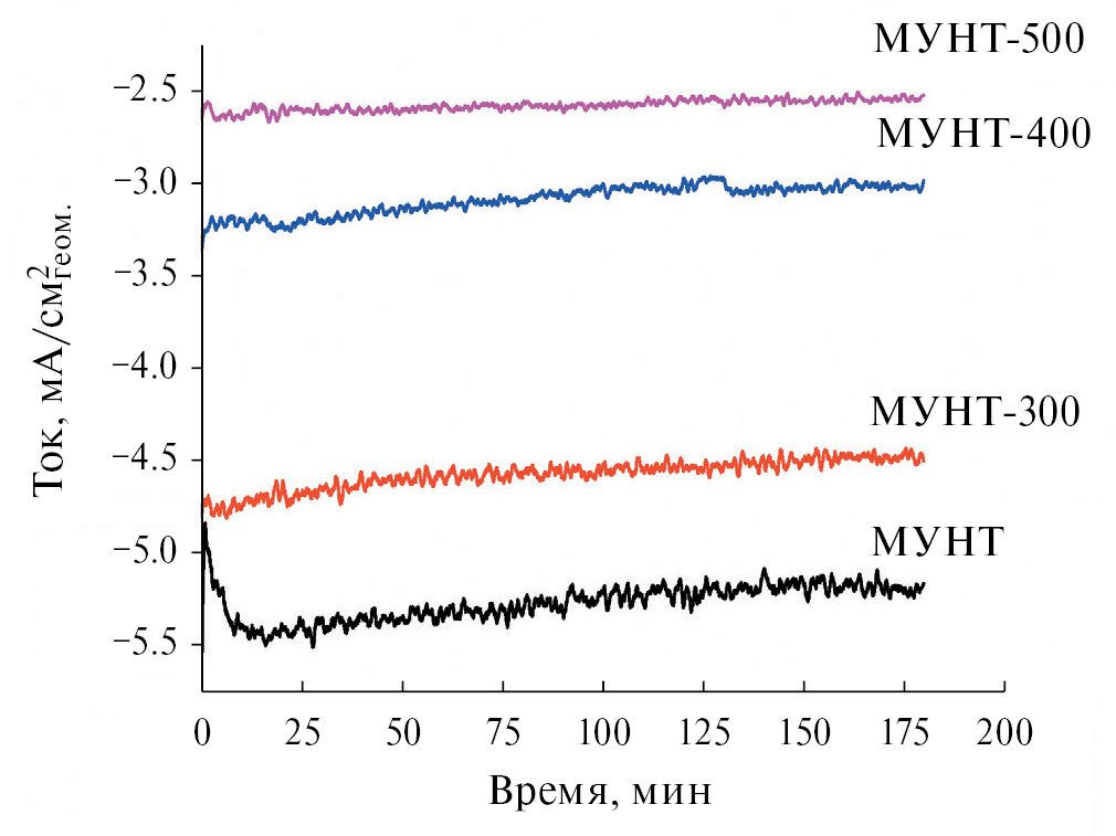 Синтез H2O2. Накопление Н2О2 проводили при постоянном потенциале в течение 3 ч, хроноамперограммы приведены на рис. 8. Увеличение температуры восстановления приводит фк снижению величины наблюдаемого тока с –5.4 мА/см2 геом для МУНТ-0 до –2.6 мА/см2 геом для МУНТ-500. Наблюдается незначительное (не более 5%) падение тока для всех катализаторов по прошествии 3 ч, что говорит о стабильности материалов в условиях эксперимента.