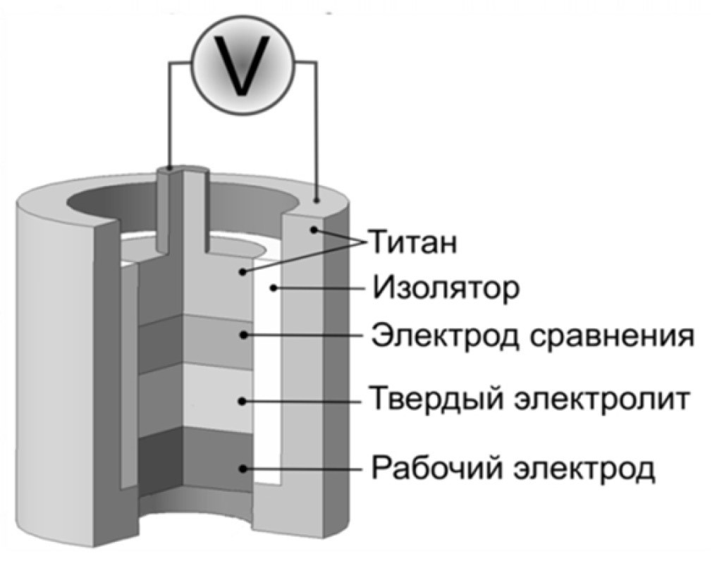 Рис. 2. Схема электрохимической ячейки для исследования сенсорных свойств исследуемых материалов.