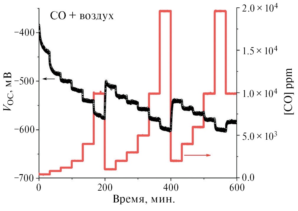 Была исследована чувствительность сенсоров с материалом рабочего электрода на основе исследуемых электрокатализаторов к индивидуальным газам (водороду и монооксиду углерода) в потоке воздуха. Примеры изменения концентрации тестируемого газа и напряжения разомкнутой цепи (VOC) сенсоров приведены на рис. 6. Отсутствие ухудшения в конечном напряжении разомкнутой цепи сенсоров при определении CO свидетельствует о толерантности исследуемых материалов к этому газу [16, 17, 29]. На вид временных зависимостей VOC не влияет природа и концентрация тестируемого газа, изменяется лишь величина конечного напряжения разомкнутой цепи (Vst), стационарная величина после изменения концентрации водорода или монооксида углерода.
