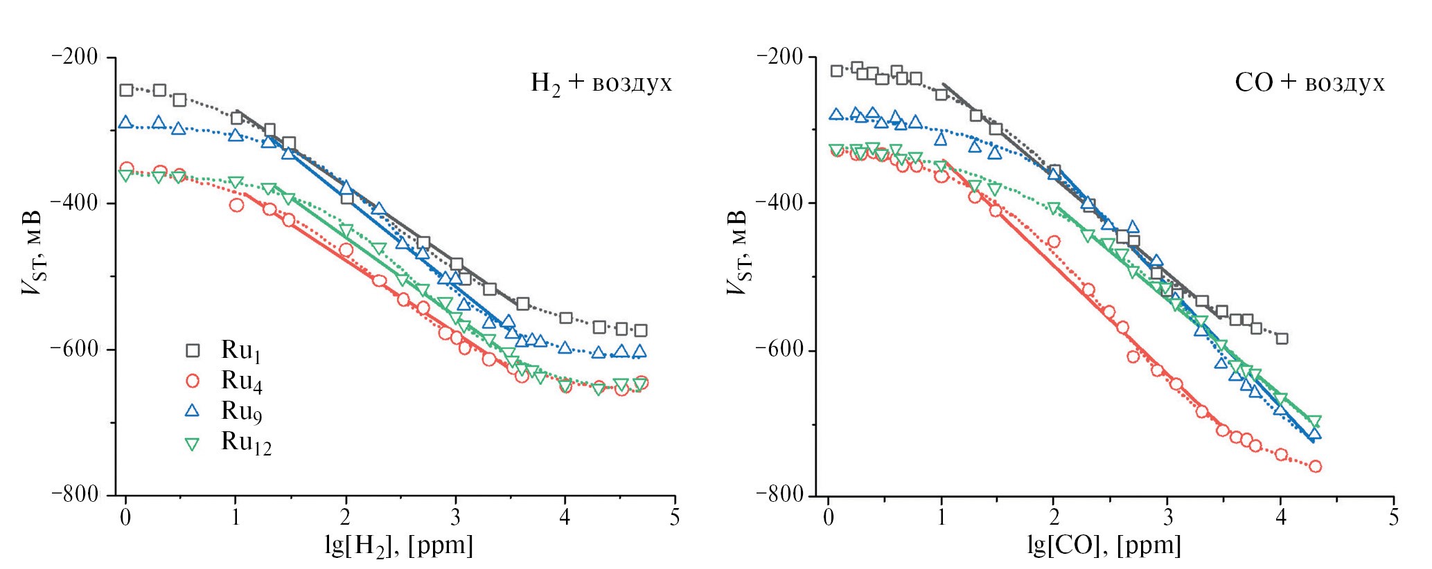 где k – эмпирический коэффициент, определяющий чувствительность сенсоров (величину, на которую изменяется Vst при изменении концентрации определяемого газа в 10 раз), V0 в данном случае – величина Vst при концентрации газа 1 ppm. Результаты аппроксимации экспериментальных данных уравнения (3) приведены в табл. 3. При определении водорода чувствительность сенсоров составляет 100–120 мВ/дек, чувствительность сенсоров к изменению CO выше (130–170 мВ/дек). Максимальной чувствительностью в обоих случаях обладает сенсор с образцом Ru9. Стоит отметить, что поведение исследуемых газовых сенсоров имеет не-нернстовский характер (k > 30 мВ/дек). Отклонение от нернстовской зависимости связано с протеканием нескольких конкурирующих электрохимических реакций окисления водорода и/или монооксида углерода и восстановления кислорода воздуха. В этом случае потенциал электрода принимает значение, при котором реализуется равенство скоростей реакций окисления и восстановления, такой потенциал называют смешанным (подробнее описано в обзоре [48]), поэтому наклон линейной части концентрационных зависимостей напряжения разомкнутой цепи может отличаться от нернстовского. Такое поведение характерно для потенциометрических газовых сенсоров [16, 29, 30, 46, 49]. Полученные сенсоры имеют сравнимые или превосходящие характеристики (чувствительность и диапазон определяемых концентраций) по сравнению с известными в литературе сенсорными системами (табл. 3).