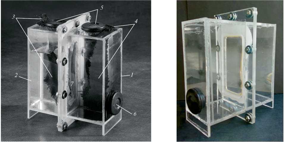 Электрогенную активность испытуемого бактериального штамма оценивали в двухкамерных БТЭ [8, 9]. В качестве материала для их изготовления использовали оргстекло Plexiglas толщиной 3 мм. Две прямоугольные камеры (каждая объемом 400 мл) сообщались друг с другом через прямоугольные отверстия (размером 40×120 мм) в боковой части каждой из камер, в которых фиксировали протонообменную мембрану “МФ-4СК” (Пластполимер, Россия). В верхней крышке каждой из камер имелись отверстия (диаметром 24 мм) для размещения рабочих электродов – углеродной ткани “Урал Т-22Р А” (Светлогорскхимволокно, Беларусь). В катодной камере также располагалось дополнительное отверстие для аэрации католита. Анодную камеру закупоривали полностью, для обеспечения анаэробных условий анолита (рис. 1).