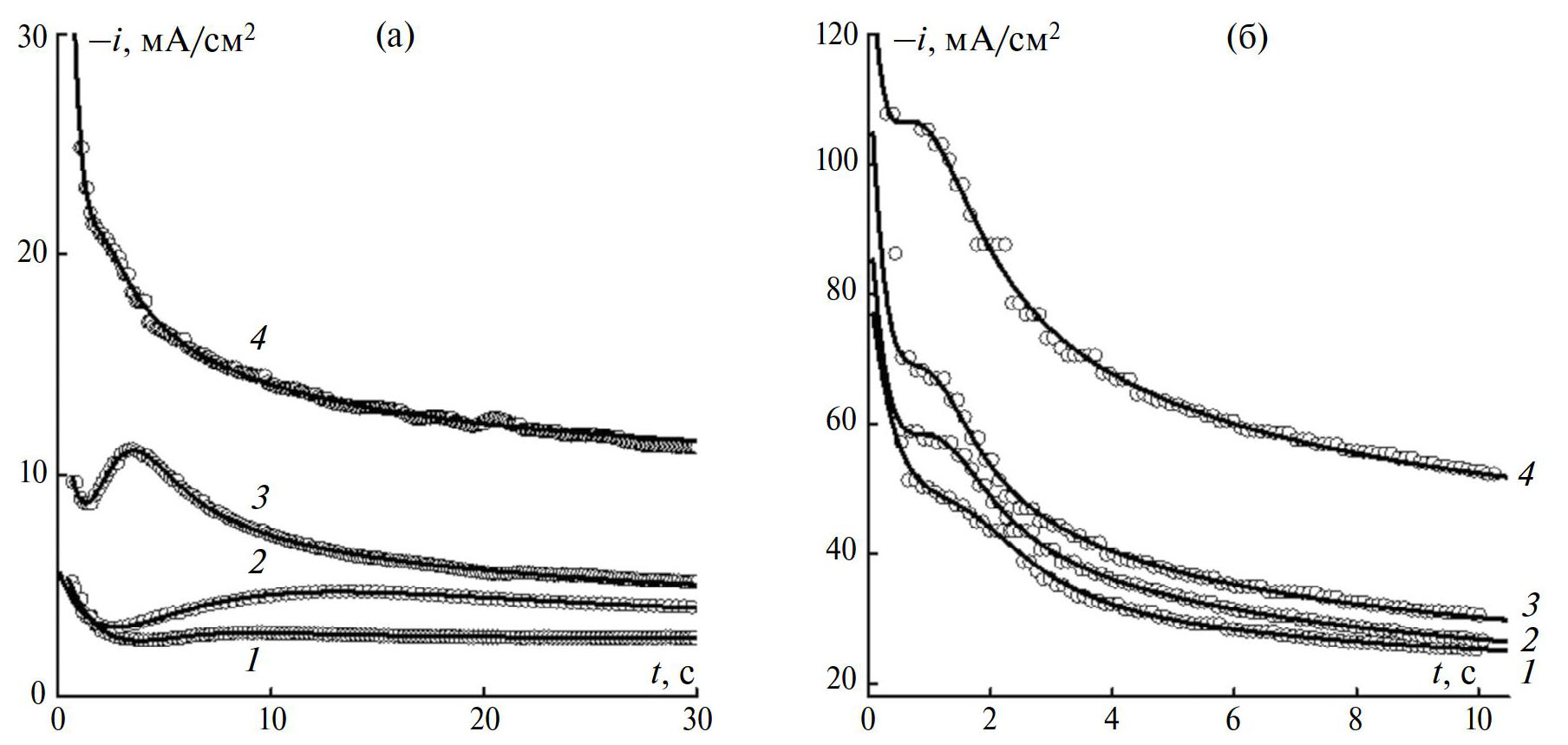 Рис. 3. Катодные хроноамперограммы, полученные на Au-электроде в 0.04 M ZnCl2 + 2 М NH4Cl (а) и 0.08 M NiCl2 + 2 М NH4Cl (б) при потенциалах осаждения Е = –860 (1), –880 (2), –900 (3), –1000 (4) мВ. Пустые маркеры – экспериментальные данные, сплошные линии – результат нелинейного регрессионного анализа по формуле (14).