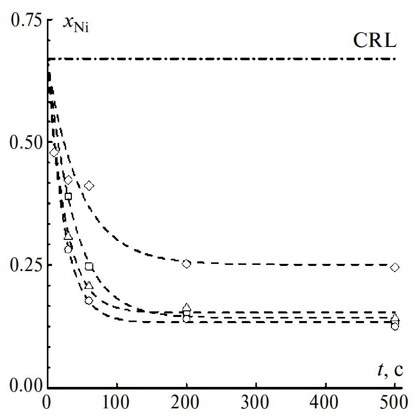 Рис. 4. Изменение атомной доли никеля в покрытии, осажденном из 0.08 M NiCl2 + 0.04 M ZnCl2 + + 2 М NH4Cl при потенциалах Еdep = –860 (), –880 (), –900 (), –1000 () мВ. Пунктир – результат нелинейного регрессионного анализа по формуле (1). Уровень CRL (composition reference line) соответствует атомной доле никеля в случае нормального осаждения, когда соотношение концентраций металлов в сплаве и ионов в растворе совпадает .