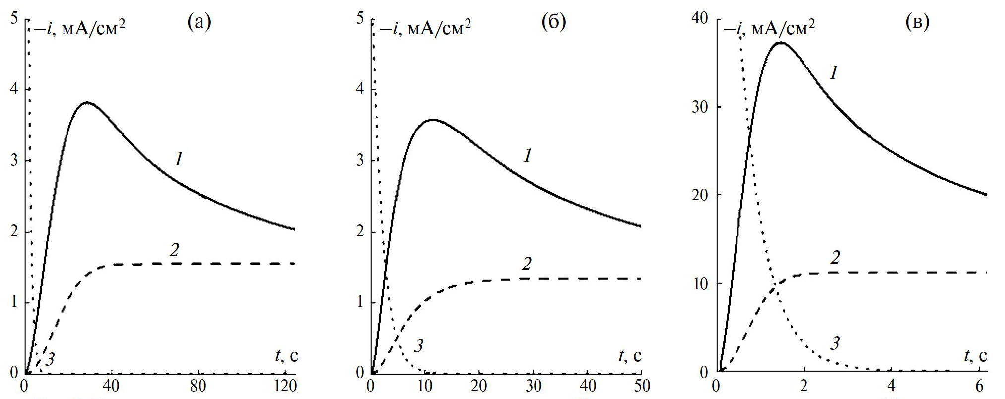 Рис. 5. Парциальные токовые транзиенты электрокристаллизации (1), реакции восстановления водорода (2) и заряжения двойного электрического слоя (3), полученные по результатам нелинейного регрессионного анализа экспериментальных хроноамперограмм на Au-электроде в 0.08 М NiCl2 + 0.04 M ZnCl2 + 2 М NH4Cl (а), 0.04 M ZnCl2 + 2 М NH4Cl (б) и 0.08 М NiCl2 + 2 М NH4Cl (в) при потенциале Е = –880 мВ.