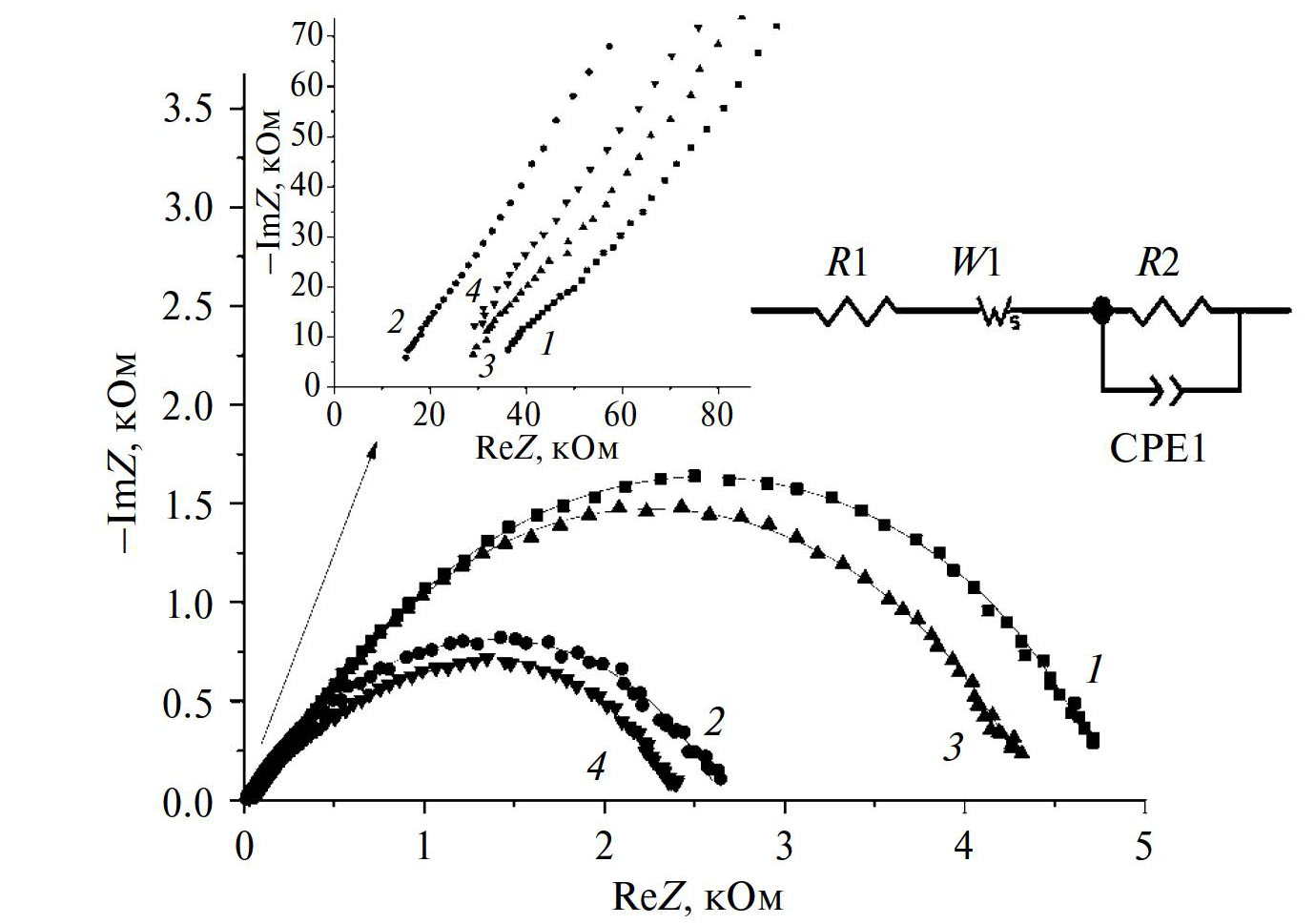 Рис. 1. Годографы импеданса ячеек Li//Li при 20°C с электролитами ПЭ (1), ПЭ* (2), НПЭ (3) и НПЭ* (4), где * – обработанные 1М LiTFSI в ДОЛ/ДМЭ, и соответствующая им эквивалентная схема.