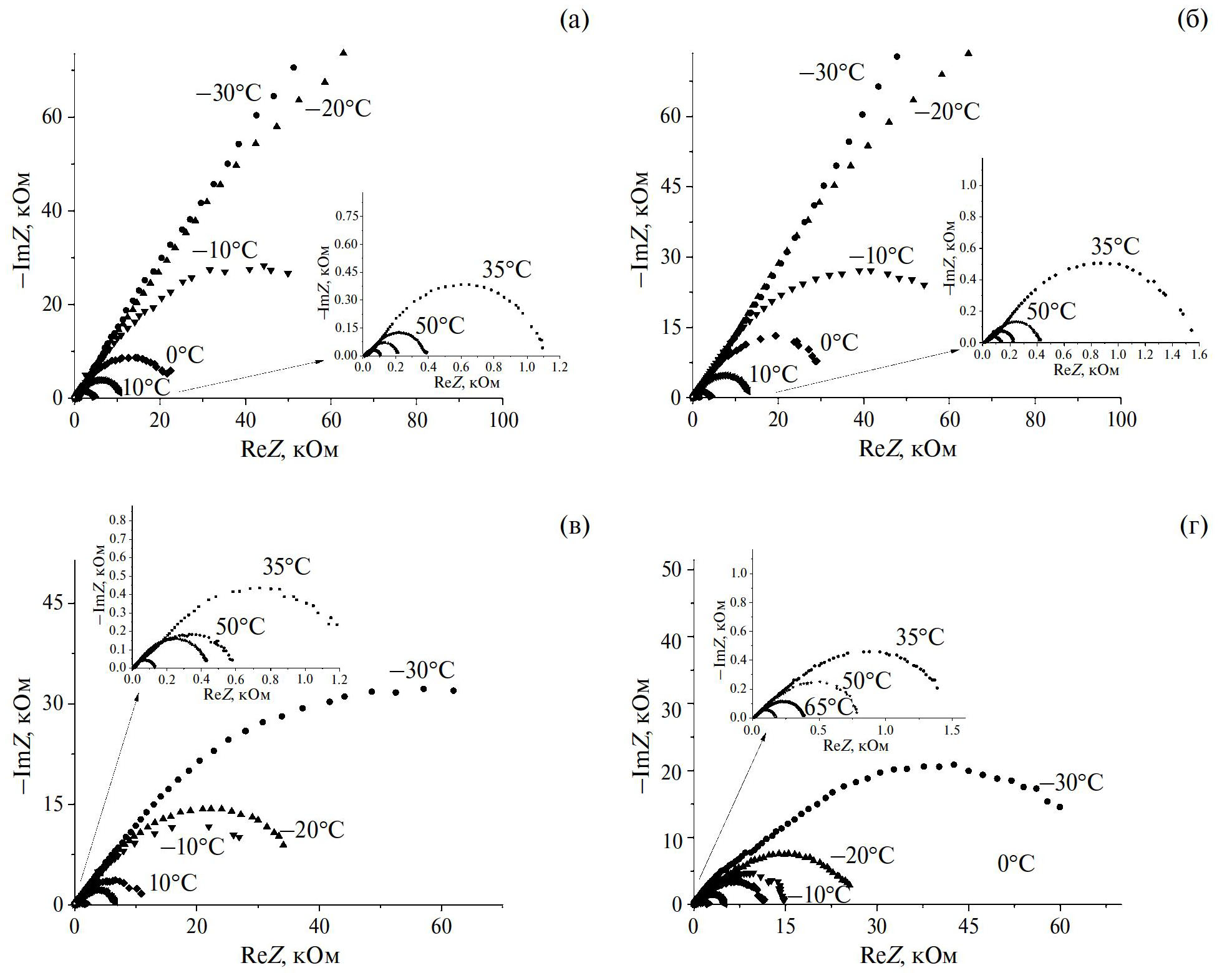 Рис. 2. Годографы импеданса ячеек Li//Li в температурном интервале от –30 до 80°C с электролитами ПЭ (а) и НПЭ (б) без обработки, с ПЭ* (в) и НПЭ* (г), обработанные 1М LiTFSI в ДОЛ/ДМЭ.