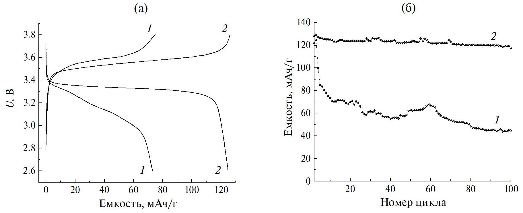 Рис. 3. Характеристики ячеек Li//LiFePO4 с ПЭ* (1) и НПЭ* (2), где (a) профили заряда –разряда для 5-го цикла, (б) зависимость разрядной емкости катода для ячеек с ПЭ* (1) и НПЭ* (2) от номера цикла при плотности тока 17 мА/г в области 2.6–3.8 В.