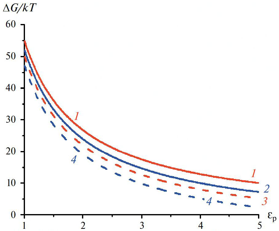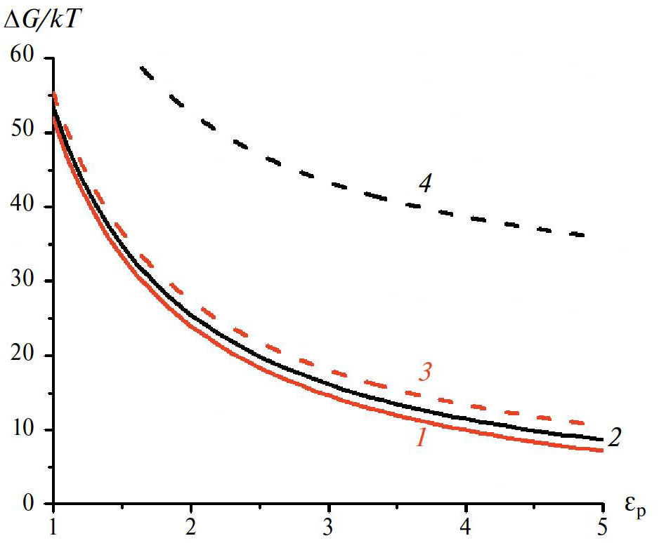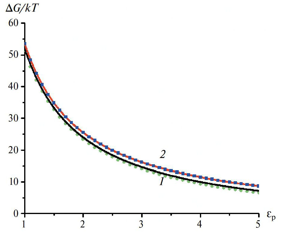 Результат работы [2] получается, если диэлектрические постоянные воды в растворе (εsol) и внутри полости (εcav) равны 80, когда в формуле (1.2) остается только первый член. Как показывает кривая 1 на рис. 1б для этого случая, высота энергетического барьера для переноса иона внутрь полости составляет десятки kT при предполагаемых значениях диэлектрической постоянной среды, окружающей полость (εp) – в соответствии с работой [2].