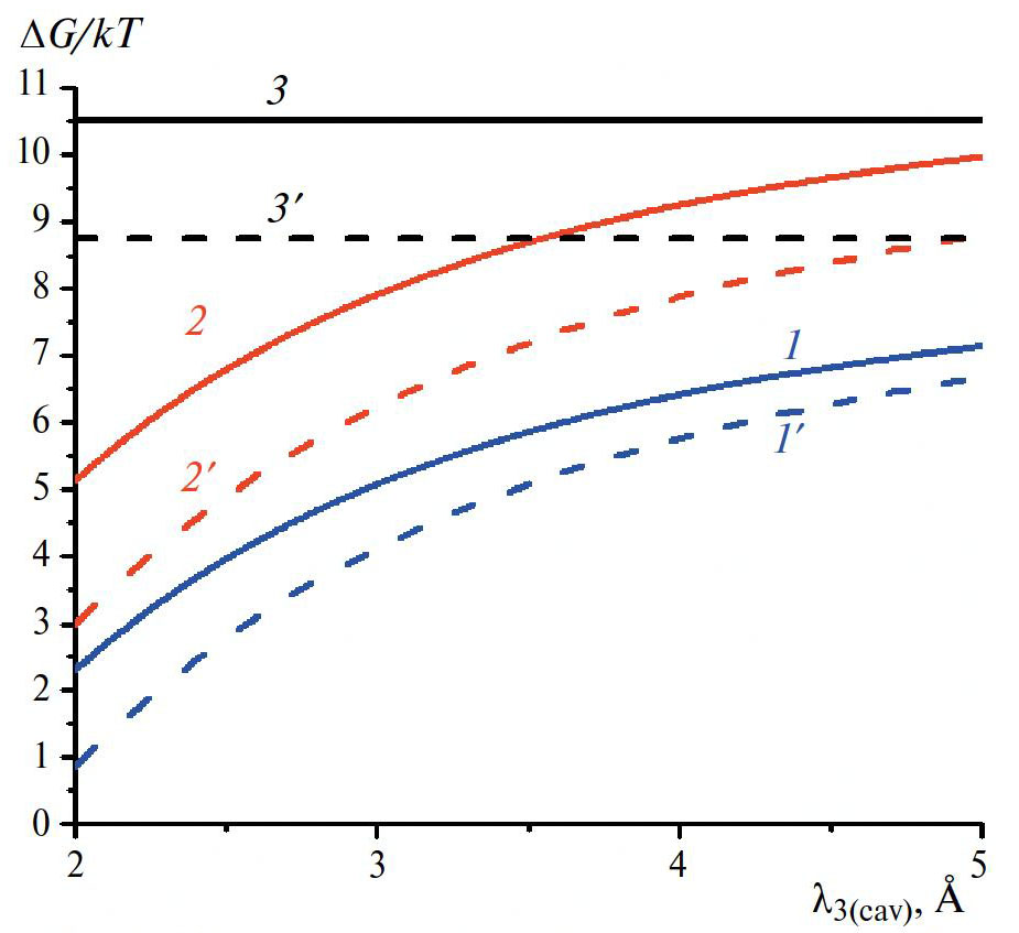 8. Fig. 5. Change in free energy (ΔG = –ΔW, in kT units) during the transition of a K+ ion to the center of the cavity depending on the correlation length λ3(cav) in the aqueous cavity. Curves 1, 1' – calculation using the formulas of the single-mode model (1M) of nonlocal electrostatics (NE). Curves 2, 2' – calculation using the formulas of the three-mode model (3M) of NE. Horizontal straight lines 3, 3' – calculation using local electrostatics (LE). For solid curves 1, 2, 3 the cavity radius R = 5Å, for dashed curves 1', 2', 3' the cavity radius R = 6Å, other parameters are given in Table 3.