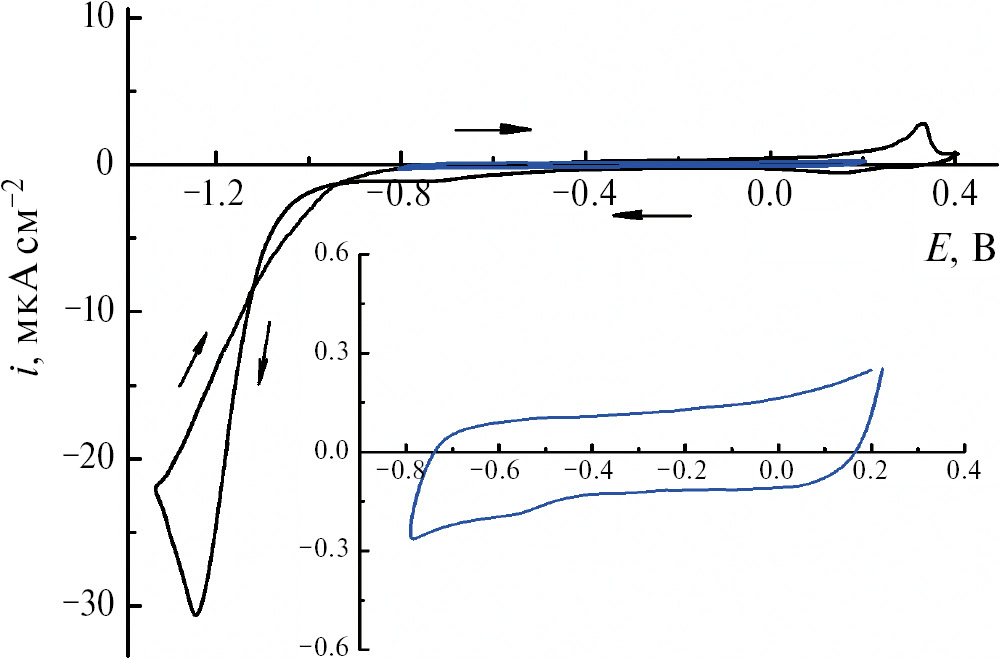 На этапе предварительных исследований на механически обновленной поверхности графитового электрода измерялись ЦВА-кривые в водных растворах KPF6, NaBF4 и LiClO4 разных концентраций с разными скоростями развертки потенциала и пределами сканирования. Было установлено, что при сканировании Е в интервале от –0.80 до 0.20 В (кривая на рис. 1 и на вставке к этому рисунку) величины плотности тока, измеренные при скорости сканирования 50 мВ/с, не превышали нескольких десятых долей мкА/см2, т. е. величин, типичных для тока заряжения ДЭС. На рис. 1 приведена также ЦВА-кривая, измеренная в более широкой области потенциалов. Как видно, сканирование потенциала в диапазоне от –1.2 до 0.4 В приводит при Е < –0.9 B к резкому росту катодного тока, связанного с началом реакции выделения водорода, и появлению небольших пиков тока при 0.35 В (анодный скан) и 0.20 В (катодный скан) в области положительных потенциалов. Поскольку природа пиков тока, наблюдаемых на ЦВА-кривых в области положительных потенциалов, нами не исследовалась, можно лишь высказать предположение об их связи с редокс-процессами, в которых участвуют присутствующие на поверхности графитового электрода функциональные группы. При этом важно отметить, что в указанном выше более узком диапазоне потенциалов эти, по-видимому, пришитые к графиту функциональные группы не проявляют редокс- активности. Отметим также, что, как следует из результатов нашей предыдущей работы, выполненной на обновляемом графитовом электроде [15], окно стабильности (область потенциалов, в которой отсутствуют фарадеевские процессы) аналогично приготовленного графитового электрода в растворах на основе пропиленкарбоната было заметно шире.