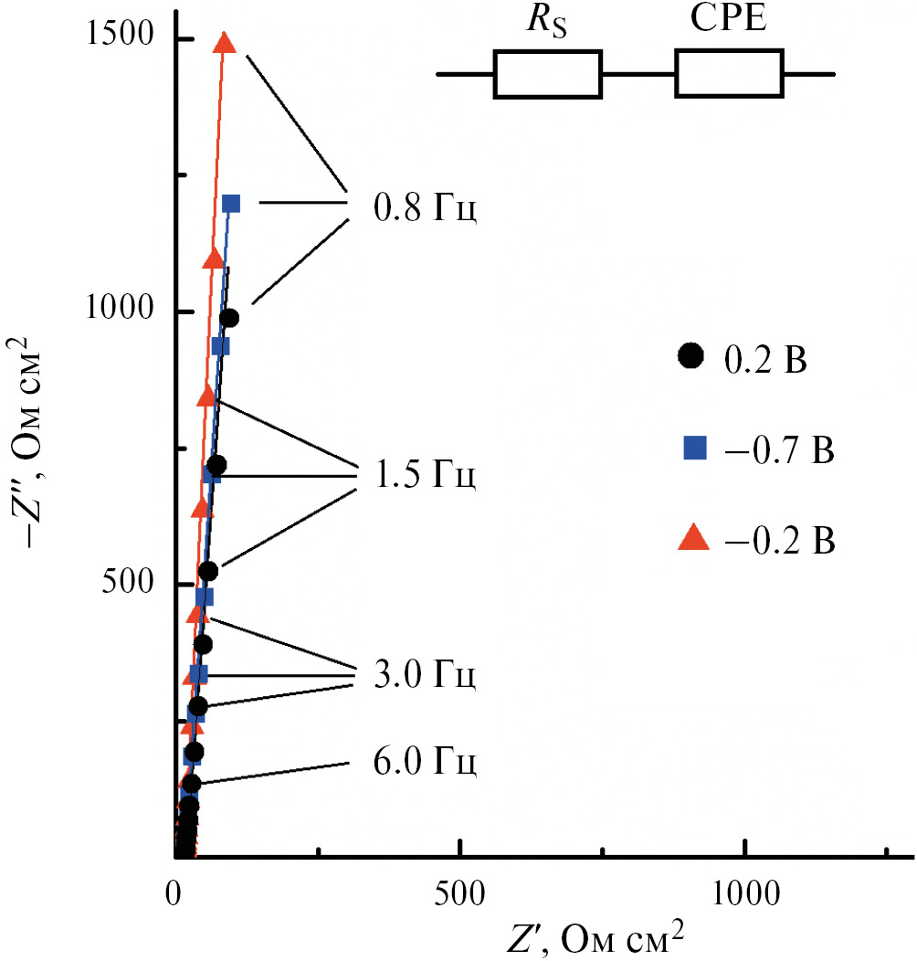 На данном графитовом электроде в установленном интервале потенциалов от –0.80 до 0.20 В, характеризующемся малыми величинами плотности тока и отсутствием пиков редокс-активности на ЦВА-зависимостях, проводились измерения спектров импеданса. В качестве примера на рис. 2 приведены диаграммы Найквиста, полученные на обновляемом графитовом электроде в водном растворе 0.05 M KPF6 при трех потенциалах в области частот от 0.5 до 2000 Гц. Измерения проводились в указанной области при 30 частотах, значения которых программа прибора автоматически распределяла в логарифмической шкале (некоторые значения частот показаны на рис. 2). Как видно, поведение электрода в этой области потенциалов близко к поведению идеально поляризуемого электрода. Об этом свидетельствует тот факт, что экспериментальные спектры представляют собой близкие к прямолинейным линии с наклоном (83–86°), лишь немного меньшим 90°. Исходя из предположения, что в исследованном интервале потенциалов на графитовом электроде не протекают фарадеевские процессы, небольшие отклонения наклона линейных Z ʺ, Z ʹ-зависимостей от 90° мы связываем, прежде всего, с существенной шероховатостью поверхности графитового электрода. Дополнительной аргументацией в пользу такой интерпретации являются данные сканирующей электронной микроскопии, полученные на образце, используемом для измерений (см. рис. 3 в нашей работе [15]).