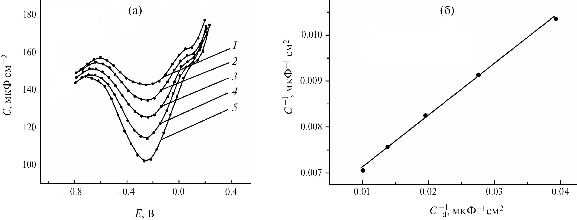 На рис. 8б рассчитанные зависимости C1 от φ1 показаны в координатах Мотта–Шоттки, т. е. C1–2 – φ1 [39]. Условно, по характеру этих зависимостей, можно выделить следующие две области потенциалов (обозначены I и II на рис. 8б). Область I характеризуется наличием интервала потенциалов, в котором величина C1–2 является линейной функцией φ1. Исходя из параметров этой прямой линии, можно получить важные характеристики полупроводникового материала, используемого в качестве электрода. Так, точка пересечения этой линии с абсциссой дает потенциал плоских зон φfb, который составляет ~0.01 В, а концентрация носителей заряда в зоне проводимости N, рассчитанная из тангенса угла наклона этой линии b по соотношению: