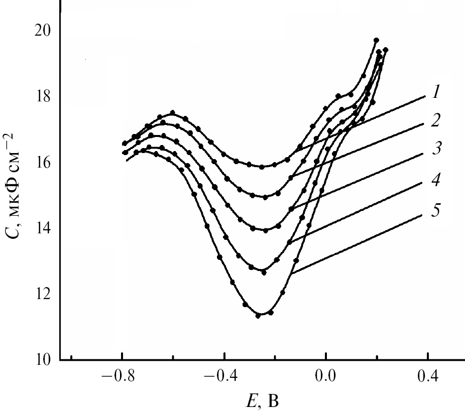 Наряду с отмеченным выше согласием приведенных на рис. 3 и 4 зависимостей, полученных в растворах KPF6, с классической теорией ДЭС следует указать, что, по сути, аналогичные зависимости были получены в растворах NaBF4. В то же время, измерения в растворах LiClO4 на графитовом электроде показали, что с ростом концентрации соли наблюдается небольшое смещение потенциала минимума в сторону более отрицательных значений. Последнее, очевидно, свидетельствует о некоторой специфической адсорбируемости анионов ClO4– на данном электроде. В этой связи детально в настоящей работе анализировались лишь результаты, полученные в растворах KPF6.