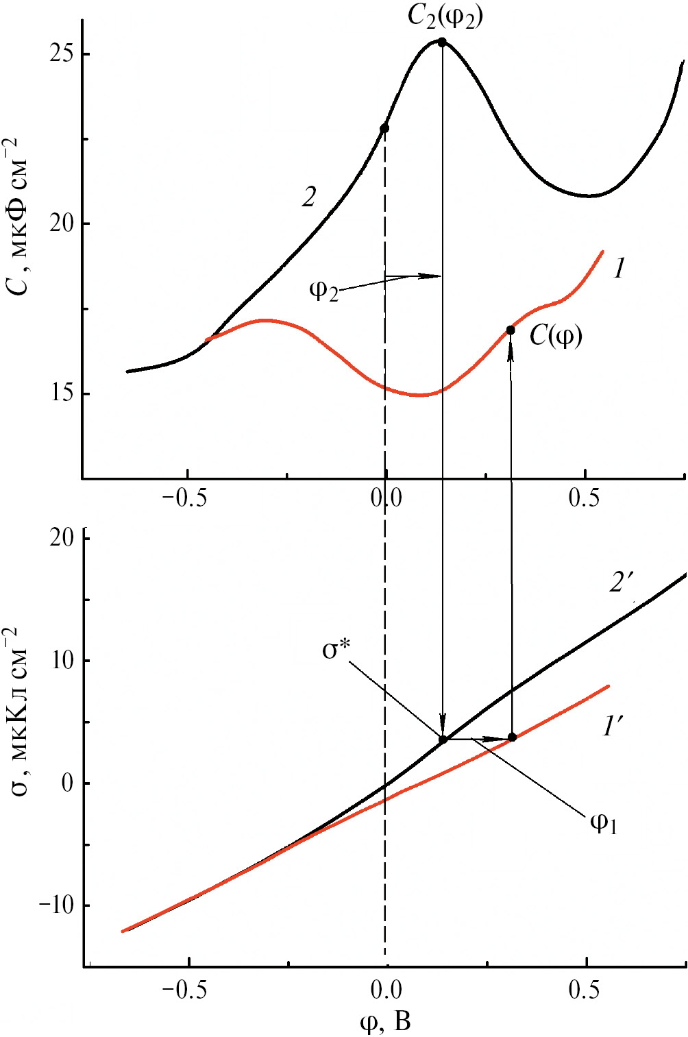 Рис. 6. Зависимости емкости (1, 2) и заряда (1 ʹ, 2 ʹ) ДЭС от потенциала φ в 0.1 М KPF6 на обновляемом графитовом электроде (1 и 1 ʹ) и ртутном электроде (2 и 2 ʹ), моделирующем границу графитового электрода с раствором электролита.